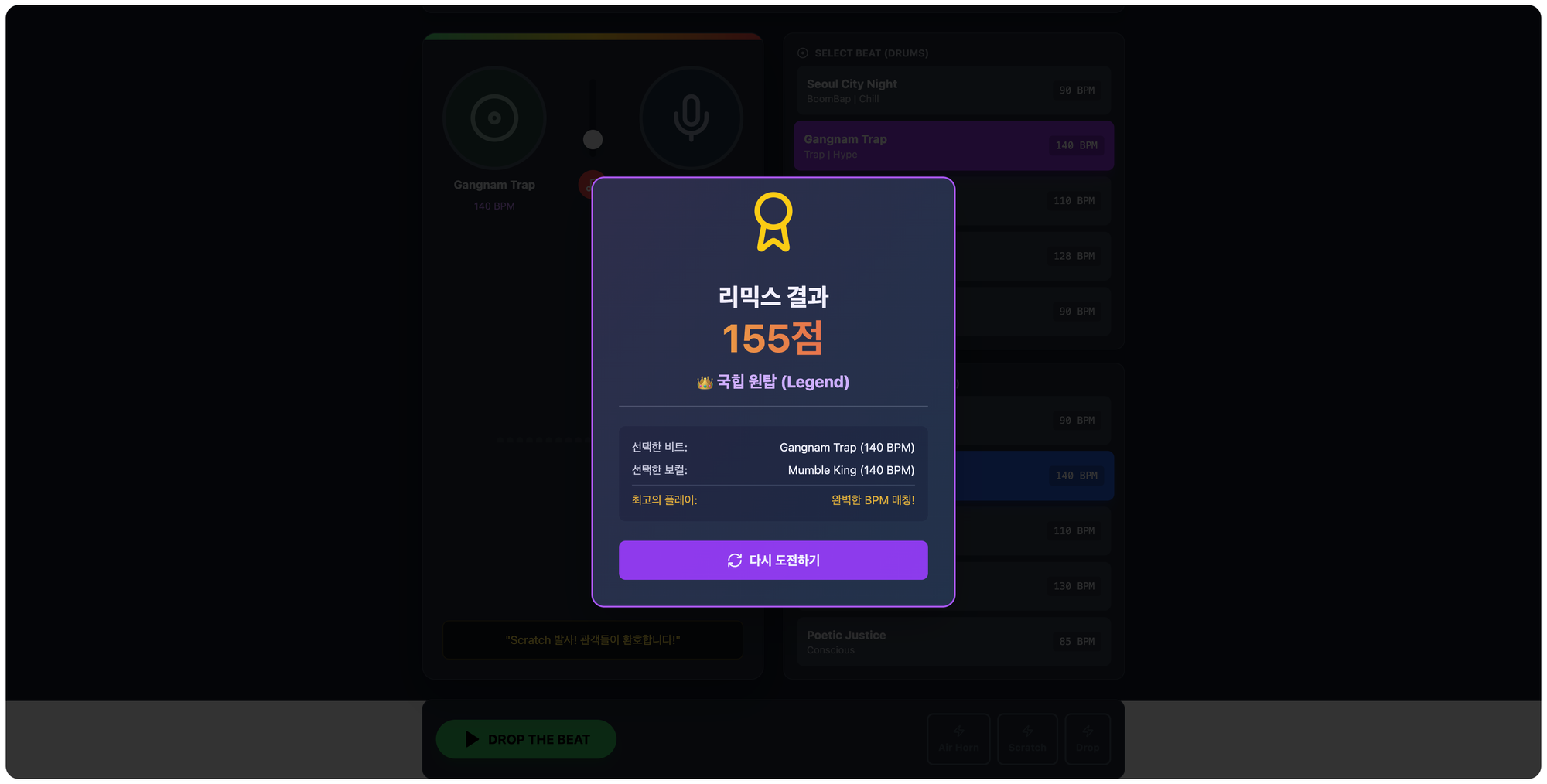 ์ ๋นํ ๋นํธ๋ฅผ ์ ํํ๊ณ ํจ๊ณผ์(Air Horn, Scratch, Drop)์ ์ ํํด์ ๋์ ํ๊ฐ๋ฅผ ํ๋ํ๋ ๊ฒ์์ ๋๋ค.
