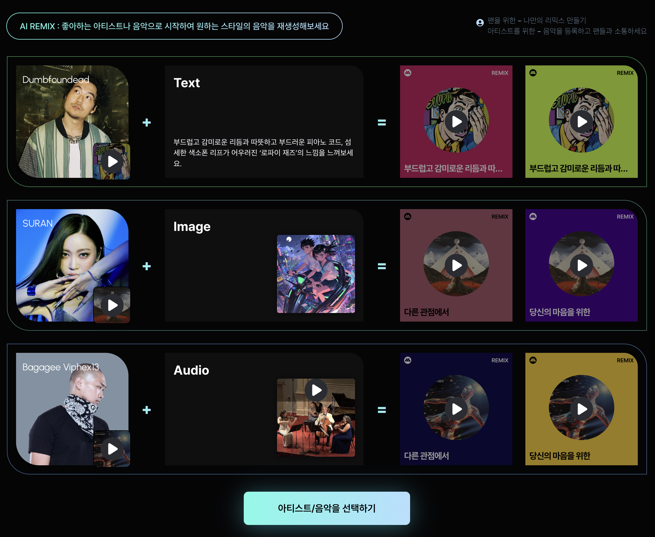 - ๊ตญ๋ด์์๋ ๋์ฌ๊ฒจ๋ณผ ๋งํ ์์ ์์ฑ AI ์คํํธ์ ์ด ์์ต๋๋ค. ๋ดํ (Neutune)์ด ์ ๋ณด์ธ โ๋ฏน์ค์ค๋์ค(MixAudio)โ๋ ์๋น์ค ์ด๊ธฐ๋ถํฐ ์ํฐ์คํธ์ ํ์ ํ ์์์ ๊ธฐ๋ฐ์ผ๋ก ํฌ๋ค์ด ํฉ๋ฒ์ ์ผ๋ก ๋ฆฌ๋ฏน์คํ๊ณ 2์ฐจ ์ฐฝ์์ ํ ์ ์๋ ๊ตฌ์กฐ๋ฅผ ๋ง๋ค์ด ์์ต๋๋ค. ์ฌ๊ธฐ์ ์์ ์ ๋ธ๋ก ๋จ์๋ก ์ชผ๊ฐ ํ์ฉ๋์ ์ถ์ ํ๊ณ , ๊ทธ ๊ฒฐ๊ณผ์ ๋ฐ๋ผ ์ํฐ์คํธ์ ์ฐฝ์์๊ฐ ์์ต์ ๋๋๋ ๊ธฐ์ ๊น์ง ์คํํ๊ณ ์์ต๋๋ค. ์๋ฌด๋๋ ์ ์ ์ฒซ ๋ฒ์งธ ์์ด๋ดํฐํฐ๋ ์ํฐ์คํธ์ด๋ค ๋ณด๋, ์ฐฝ์์์ ๊ณต์ ๊ด๊ณ๋ฅผ ๋๋ชจํ๋ ์ด๋ฐ ์คํํธ์ ์ด ๋์ฑ๋ ์กฐ๋ช ์ ๋ฐ์ผ๋ฉด ์ข๊ฒ ์ต๋๋ค :)