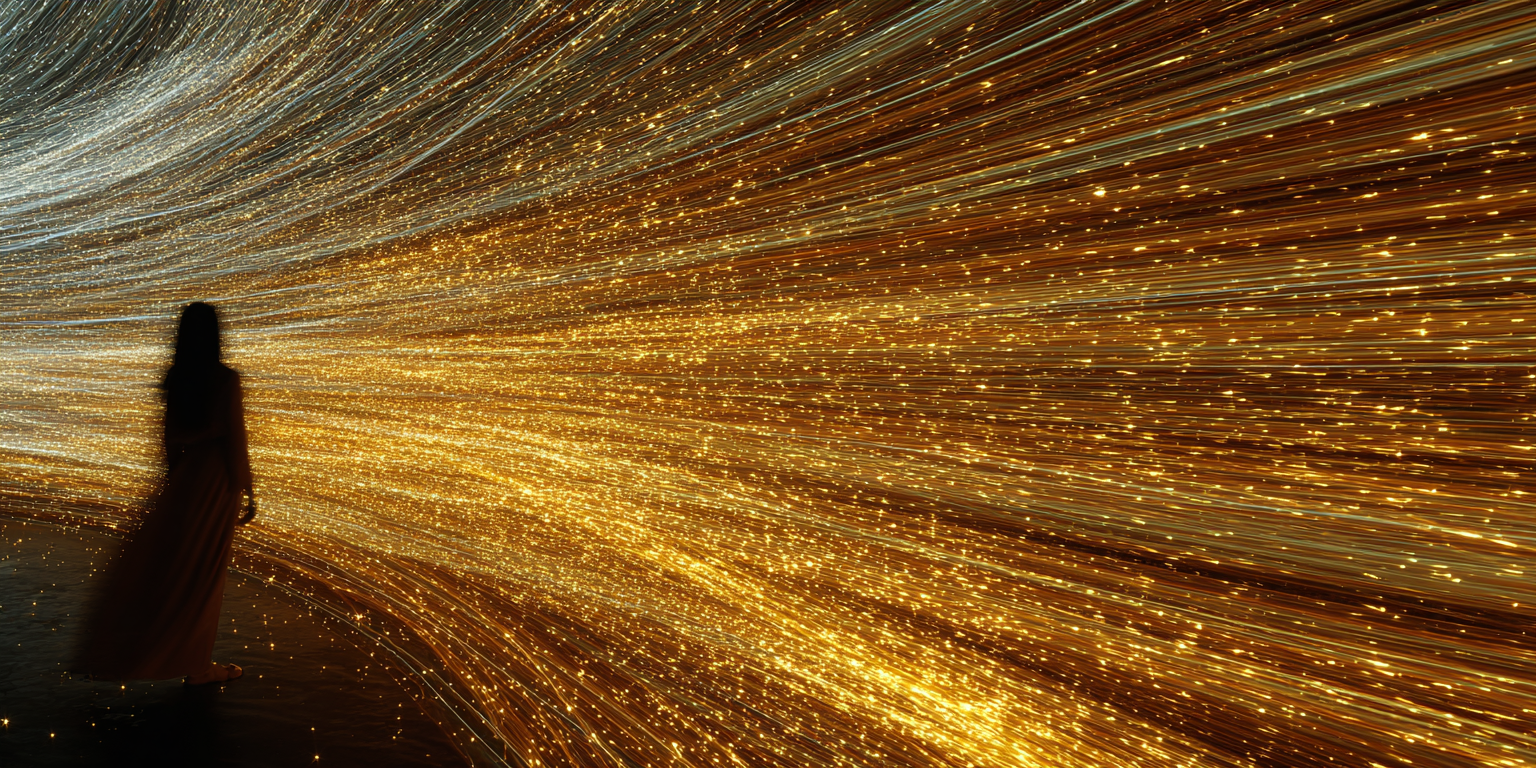 cinematic film still of a human figure swallowed by colossal golden waves of light, ecstatic and dangerous energy, swirling vortex patterns, motion blur, abstract ocean of euphoria, fine particles glowing in the air, ultra detailed, high contrast, dramatic lighting, 35mm photography, immersive and hypnotic atmosphere --chaos 5 --ar 2:1 --raw --stylize 150
