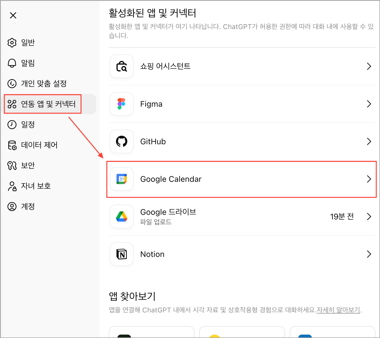 ์ฑGPT์์ ๋์ผํ ์์ฒญ์ ํ๋ ค๋ฉด ์ฐ์ ์ฑGPT์ ๊ตฌ๊ธ ์บ๋ฆฐ๋๋ฅผ ์ฐ๊ฒฐํด์ผ ํฉ๋๋ค. ์ค์ ์์ ์ฐ๋ ์ฑ ๋ฐ ์ปค๋ฅํฐ์์ ๊ตฌ๊ธ ์บ๋ฆฐ๋๋ฅผ ํด๋ฆญํ์ฌ ์ฐ๊ฒฐํฉ๋๋ค.