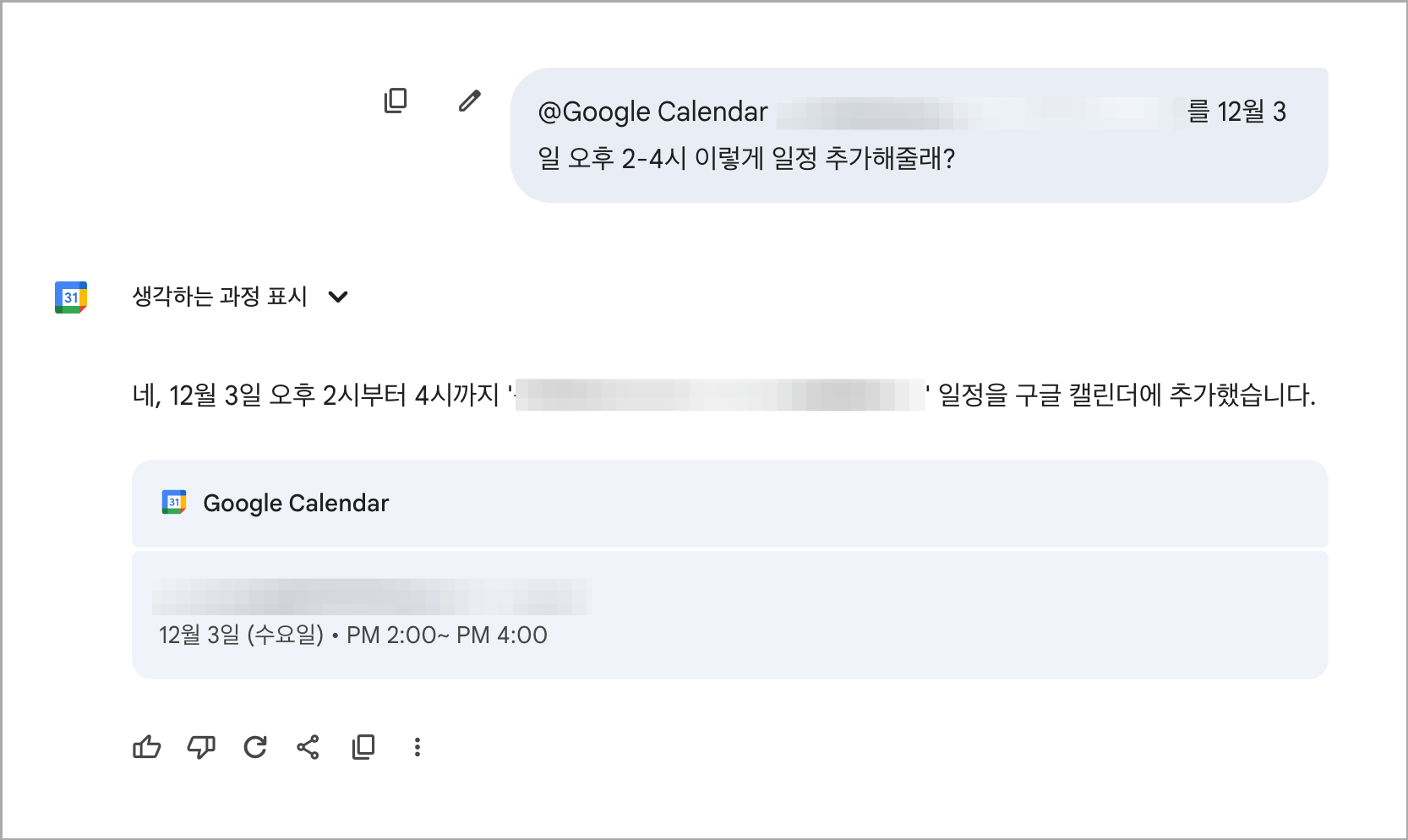 - ๊ตฌ๊ธ ์บ๋ฆฐ๋๋ฅผ ์ ๋ฌด์ ์์ฃผ ์ฌ์ฉํ๊ณ ๋จ์ํ ์ผ์ ๋ฑ๋ก๋ง ์ํ๋ค๋ฉด gemini๋ฅผ ์ฌ์ฉํ๋ ๊ฒ์ด ํธ๋ฆฌํฉ๋๋ค. ์ผ์์ ์๊ฐ๋๋ฅผ ๋ง์ฐ์ค๋ก ์ ํํ์ง ์๊ณ ๋ง๋ง ํด๋ ์บ๋ฆฐ๋ ๋ฑ๋ก์ด ๋๊ธฐ ๋๋ฌธ์ ๋๋ค. (์ง์ ๊ฒฝํํด๋ณด์๋ ๊ฑธ ์ถ์ฒ๋๋ฆฝ๋๋ค)