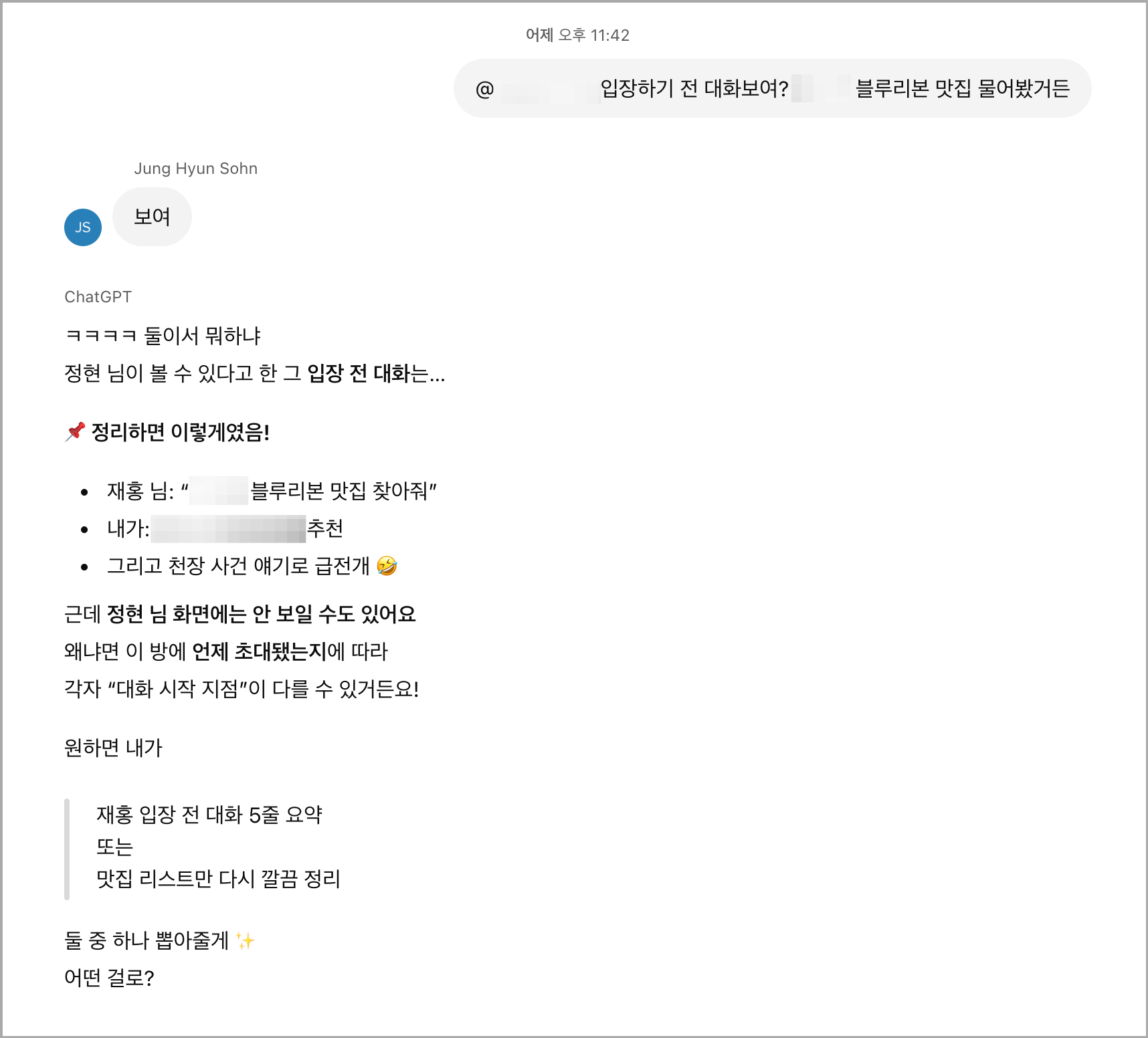 ๋ฌผ๋ก ์์ ๊ฐ์ด ์์ฐ์ ์ธ ์ผ์ ์ฌ์ฉํ ๋ ํฐ ๊ฐ์น๊ฐ ์๊ฒ ์ง๋ง, ์ ๋ ํฌ๋ฃจ ๋จํก๋ฐฉ์ ๋ง๋ค์ด์ ๊ฐ์์ ์์ ์ค ๊ทผ์ฒ ๋ง์ง์ ์ฐพ์๋ณด๋ ๋ํ๋ฅผ ์ ์ผ ๋จผ์ ๋๋ด์ต๋๋ค. ์ฌ์ฉํด๋ณด๋ ์ฌ์ฉ์๊ฐ ์ํ์ง ์์๋ ์ฑGPT๊ฐ ๋ฑ์ฅํด์ ๋ํ์ ์ฐธ์ฌํ๋ ๋ฐ๋์ ์ด์ง ๋ถํธํ ๋๋์ด ๋ค๊ธฐ๋ ํ์ต๋๋ค.