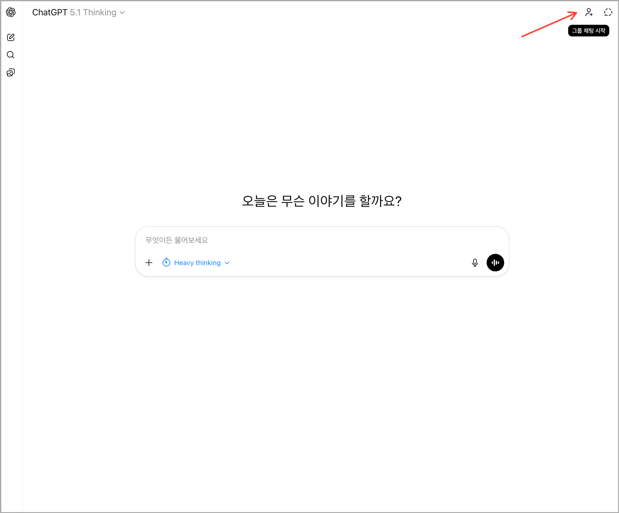 ๊ธฐ์กด ์ฑํ ์์๋ ์ค๋ฅธ์ชฝ ์๋จ '์ฌ๋ ์ถ๊ฐ ์์ด์ฝ'์ ํด๋ฆญํ๋ฉด ๊ทธ๋ฃน ์ฑํ ์ ์์ํ ์ ์์ต๋๋ค.