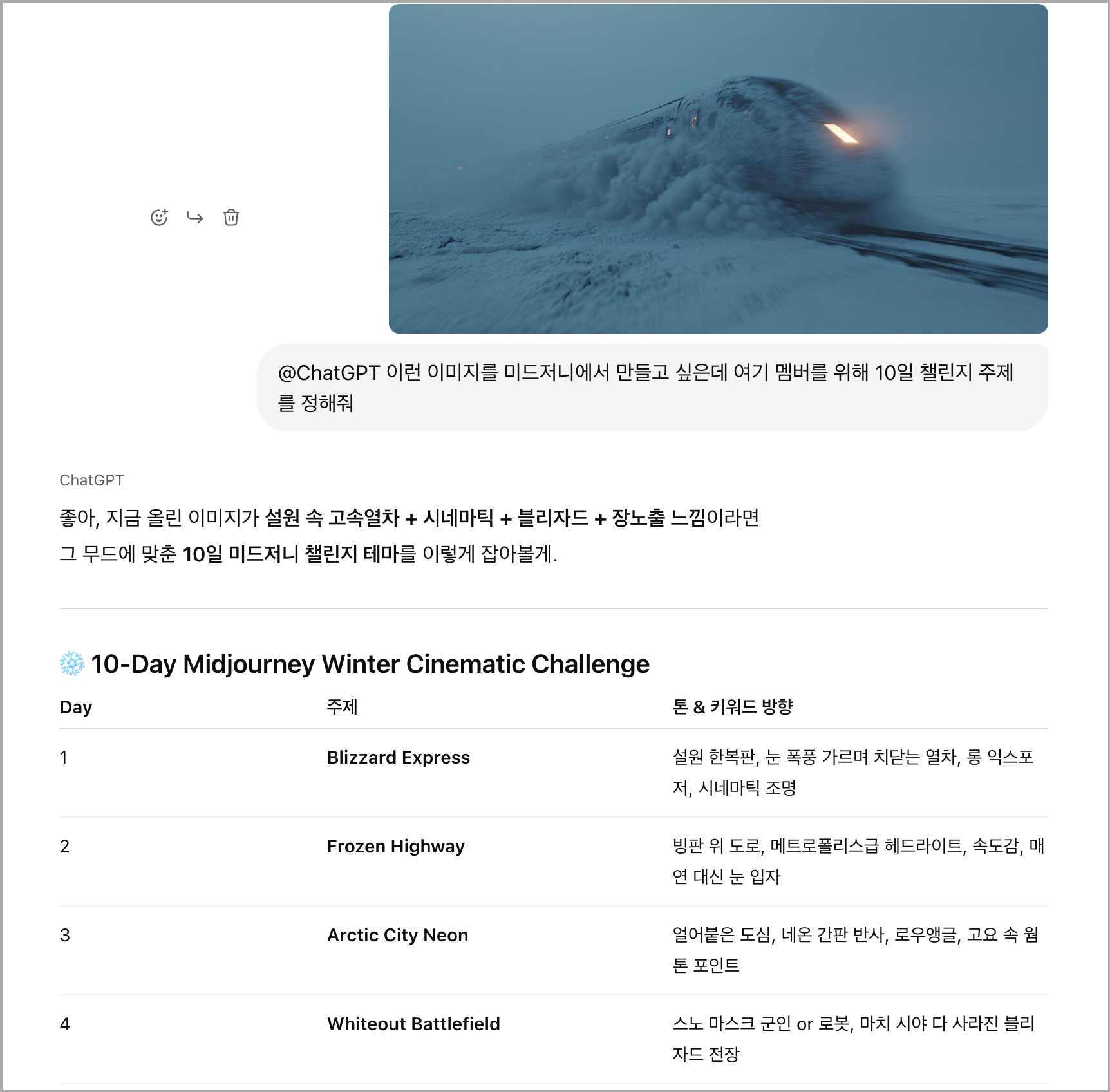 - ์๋์ ๊ฐ์ด ์ด๋ฏธ์ง ์์ฑ ์ฑ๋ฆฐ์ง ๊ทธ๋ฃน์ฑํ ๋ฐฉ์ ๋ง๋ค์ด ์ด์ํ๋ ๊ฒ๋ ๊ฐ๋ฅํ ๊ฒ ๊ฐ์ต๋๋ค. ์ฑ๋ฆฐ์ง์ ์ฐธ์ฌํ ๋ฉค๋ฒ๋ฅผ ํ ๊ทธ๋ฃน์ฑํ ๋ฐฉ์ ๋ชจ์ผ๊ณ , ์์ฑํ ์ด๋ฏธ์ง ์ฃผ์ ๋ฅผ ์ฑGPT์๊ฒ ์ ํด๋ฌ๋ผ๊ณ ํ ์ ์์ต๋๋ค.