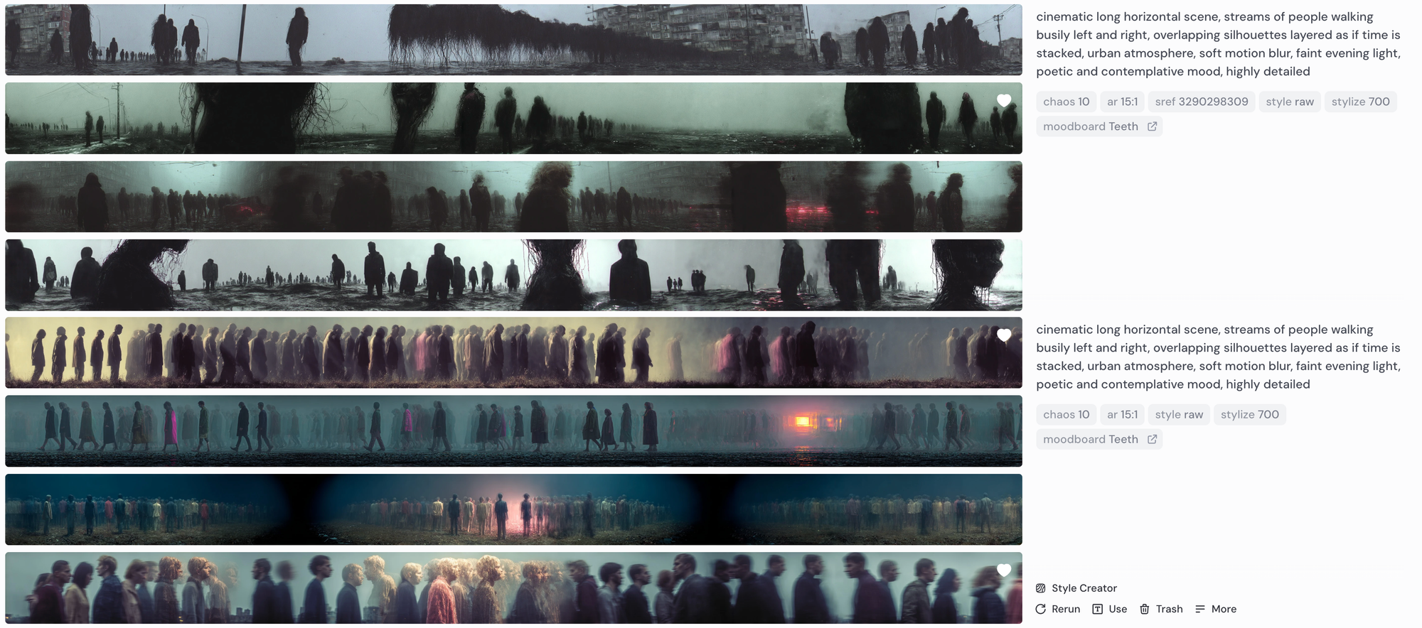 ์ฑGPT๊ฐ ๋ง๋ค์ด์ค ํ๋กฌํํธ๋ฅผ Midjourney์ ์ ๋ ฅํ์ฌ ์ด๋ฏธ์ง๋ฅผ ์์ฑํ๊ณ , ๊ทธ ์ค์์ ๊ณจ๋ผ ์์์ ์์ฑํฉ๋๋ค. ๋ถ์๊ธฐ์ ์คํ์ผ์ Moodboard ๊ธฐ๋ฅ์ ํ์ฉํ๊ฑฐ๋ ์คํ์ผ ๋ ํผ๋ฐ์ค ๊ธฐ๋ฅ์ ์ ๊ทน ํ์ฉํฉ๋๋ค.