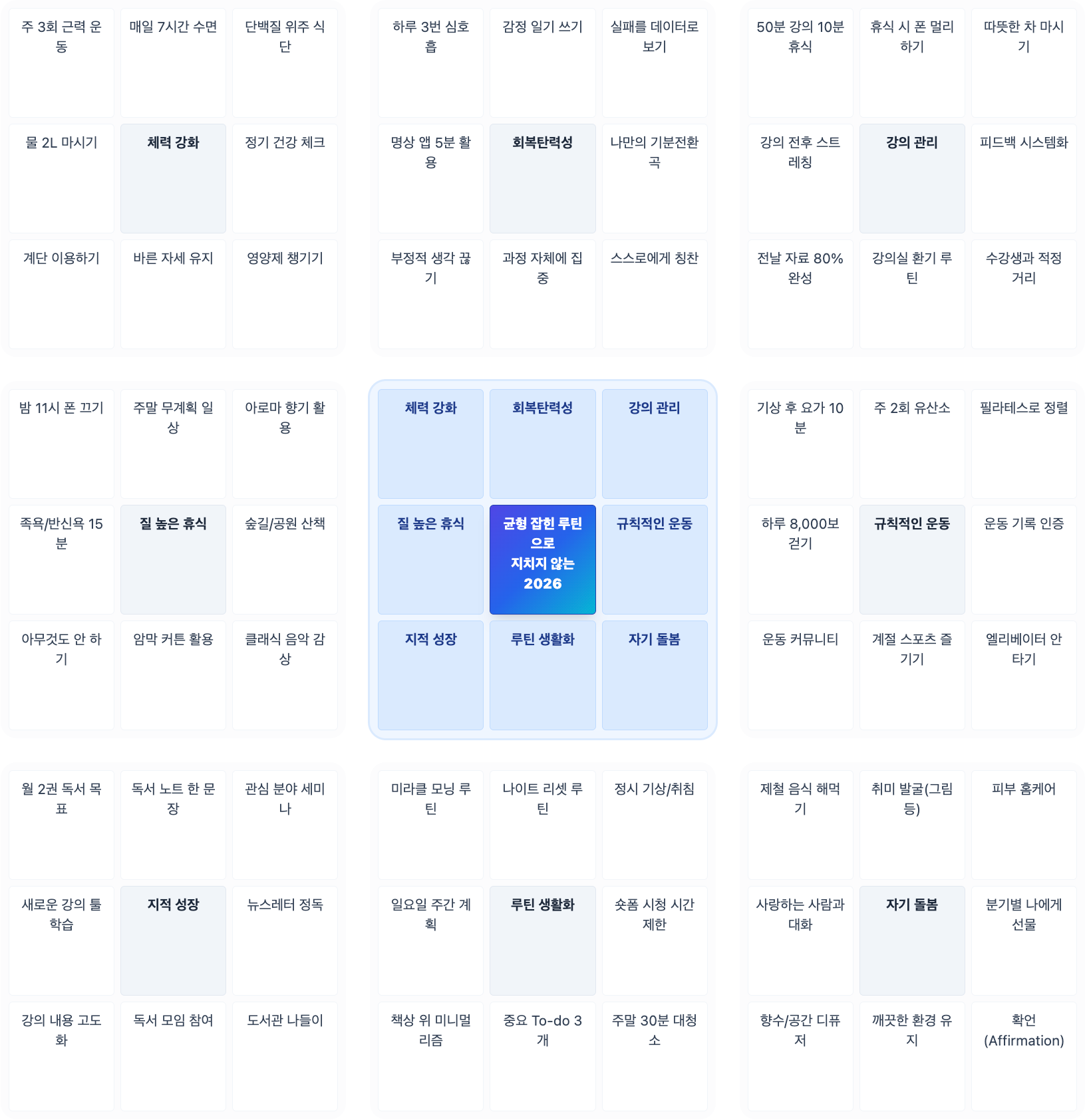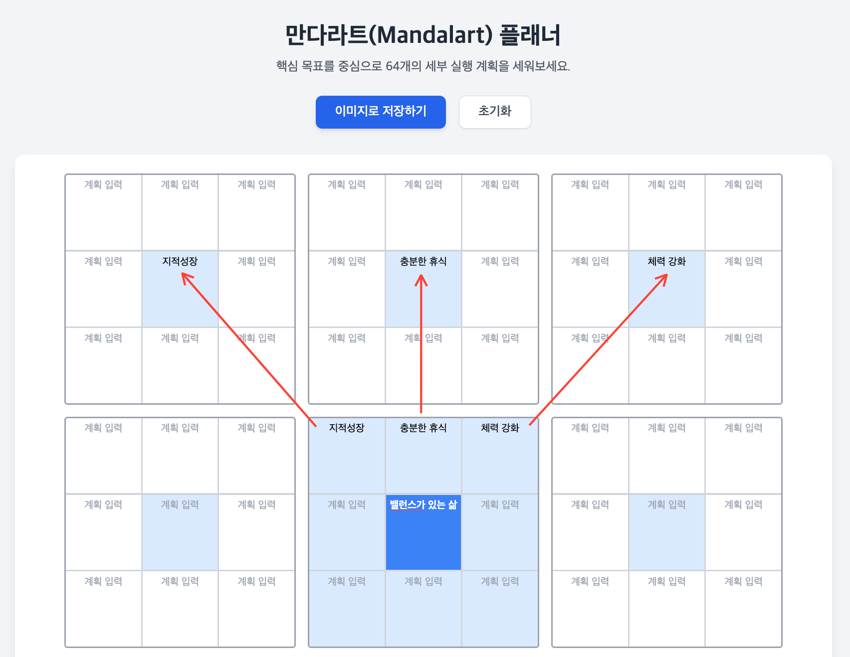 λ§λ€λΌνΈ(Mandalart) νλλμ ν΅μ¬ λͺ©νλ₯Ό μ€μ¬μΌλ‘ μμ΄λμ΄λ₯Ό μ°κ½μ²λΌ νμ₯ν΄ λκ°λ μκ°μ μΈ λͺ©ν λ¬μ± κΈ°λ²μ λλ€. 3x3 격μμ μ€μμ μ΅μ’ λͺ©μ μ§λ₯Ό μ κ³ , μ΄λ₯Ό λλ¬μΌ 8κ°μ μΉΈμ μΈλΆ κ³Όμ λ₯Ό μ±μ΄ λ€, λ€μ κ·Έ κ³Όμ λ€μ κ°κ°μ μ€μ¬μ λμ΄ μ΄ 64κ°μ ꡬ체μ μΈ μ€μ² λ°©μμ λμΆνλ λ°©μμ λλ€.