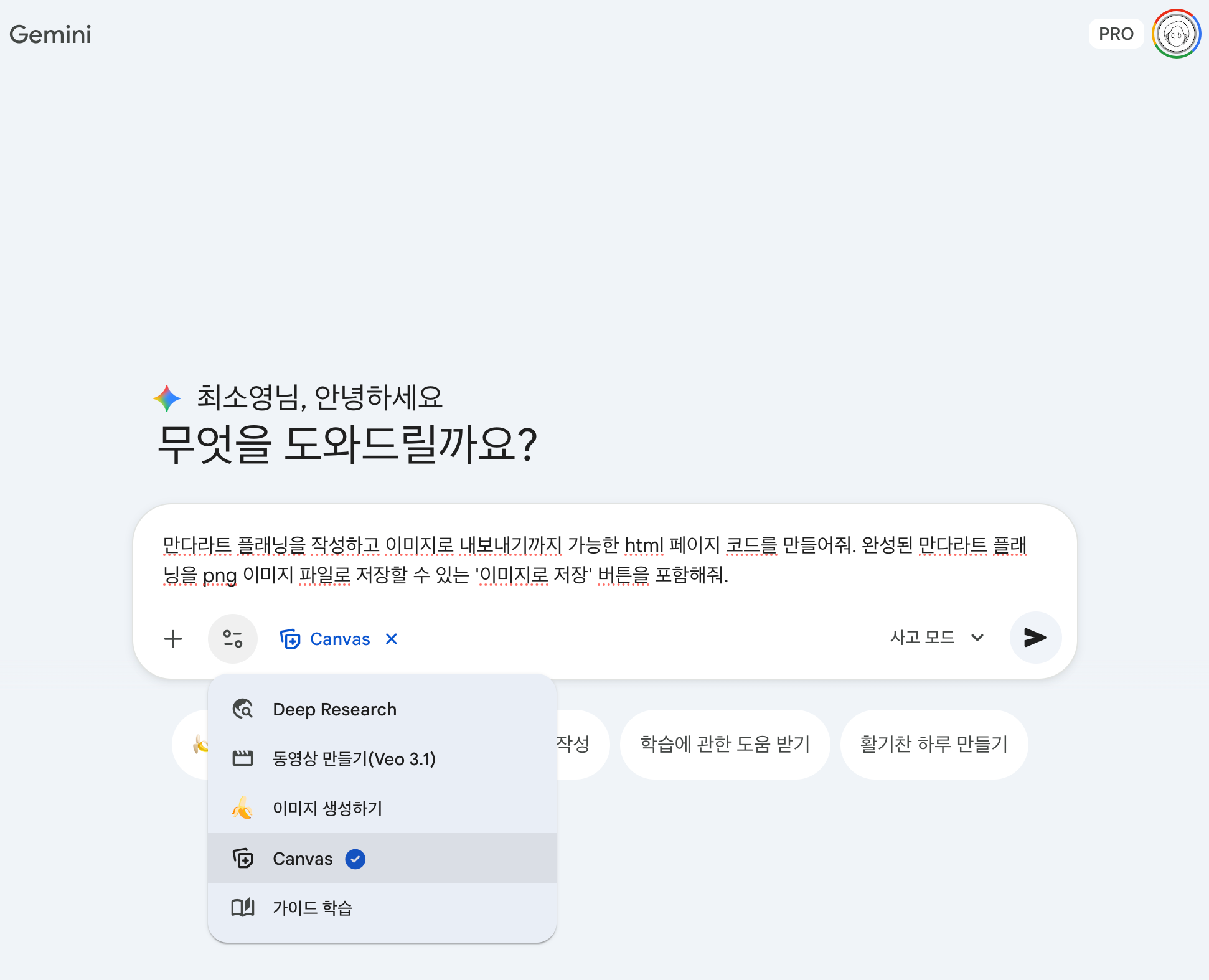 Gemini νμ΄μ§μμ 'μΊλ²μ€' λ²νΌμ ν΄λ¦ν λ€ ν둬ννΈλ₯Ό μ λ ₯ν©λλ€.