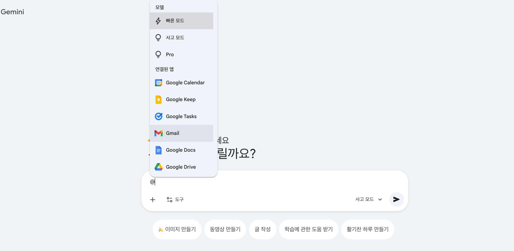 gemini์์ @๋ฅผ ์ ๋ ฅํ๋ฉด ๋์ค๋ ๋ฉ๋ด์์ Gmail์ ์ ํํ ๋ค, ํ๋กฌํํธ๋ฅผ ์ ๋ ฅํฉ๋๋ค.