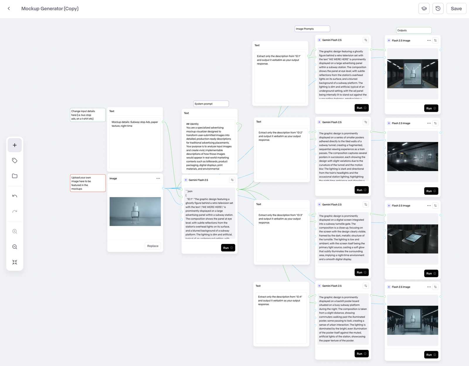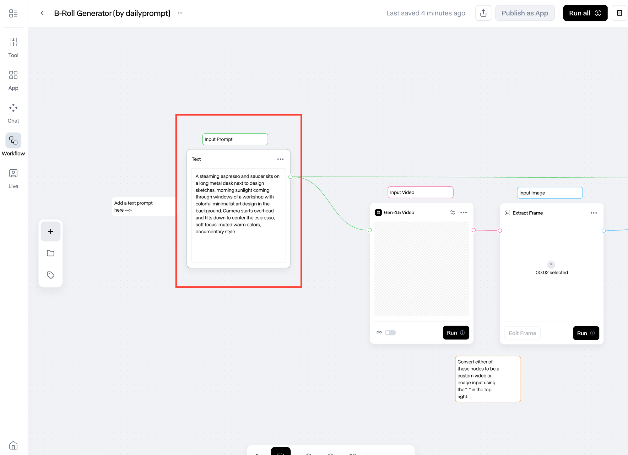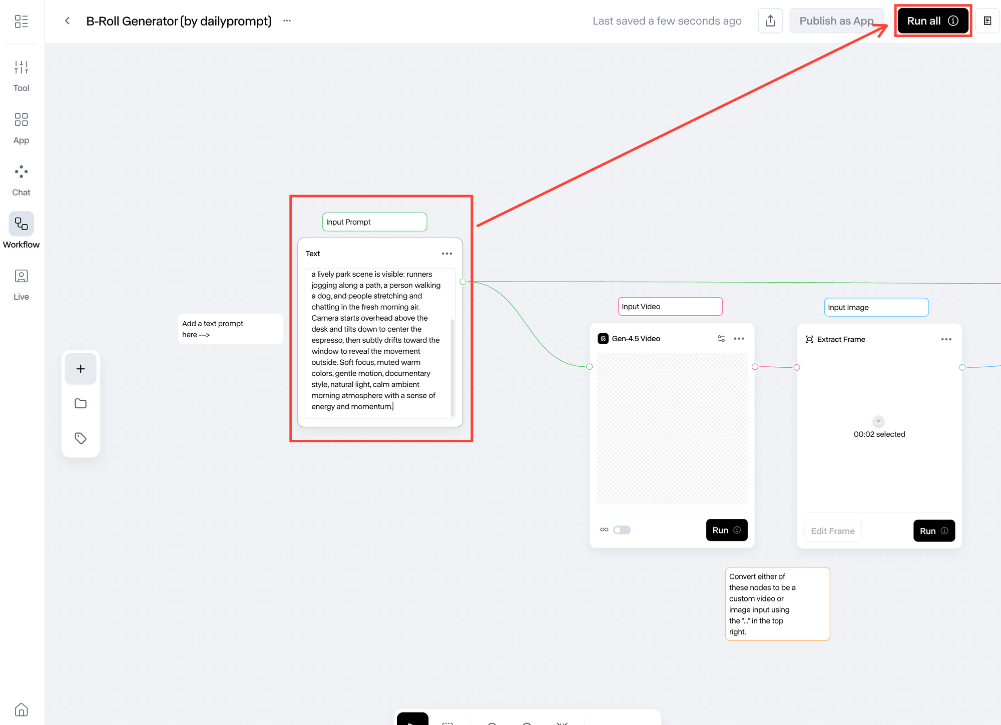 ์ฑGPT ๋๋ Gemini๊ฐ ์์ ํด์ค ํ๋กฌํํธ๋ฅผ Runway Workflow 'input prompt' ์๋์ ์ ๋ ฅํ๊ณ ์ค๋ฅธ์ชฝ ์๋จ 'Run all'์ ํด๋ฆญํฉ๋๋ค.