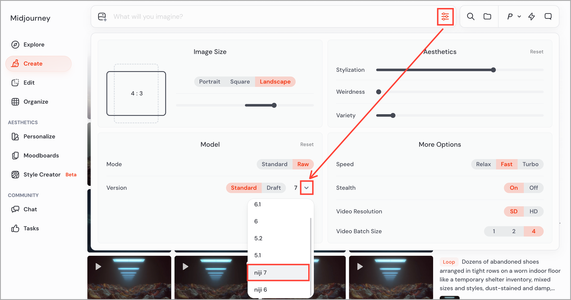Niji 7 ๋ชจ๋ธ์ ์ฌ์ฉํด๋ณด์๋ ค๋ฉด, Midjourney ์นํ์ด์ง์ ์ ์ํ ๋ค ๋ค์๊ณผ ๊ฐ์ด ์ค์ ์์ 'niji 7'์ ์ ํํฉ๋๋ค.