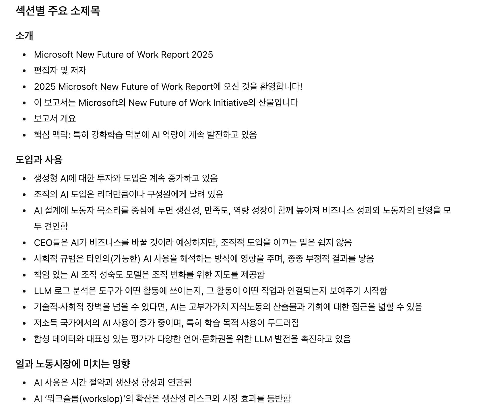 λ¨Όμ λ§μ΄ν¬λ‘μννΈμ <λ Έλμ μλ‘μ΄ λ―Έλ(New Future of Work>)λ μ΄ λ§ν¬μμ λ€μ΄λ‘λ λ°μΌμ€ μ μμ΅λλ€. νμΌμ λ€μ΄λ‘λ λ°μ보μλ©΄, μλμ κ°μ΄ μΉ΄ν κ³ λ¦¬, ν° μ λͺ©, μμΈ bullet pointλ‘ κ΅¬μ±λ κ²μ λ³΄μ€ μ μλλ°μ, μ¬κΈ°μ ν° μ λͺ©λ§ μΆμΆν΄μ νκ΅μ΄λ‘ λ²μν΄λ¬λΌκ³ μμ²ν©λλ€.
