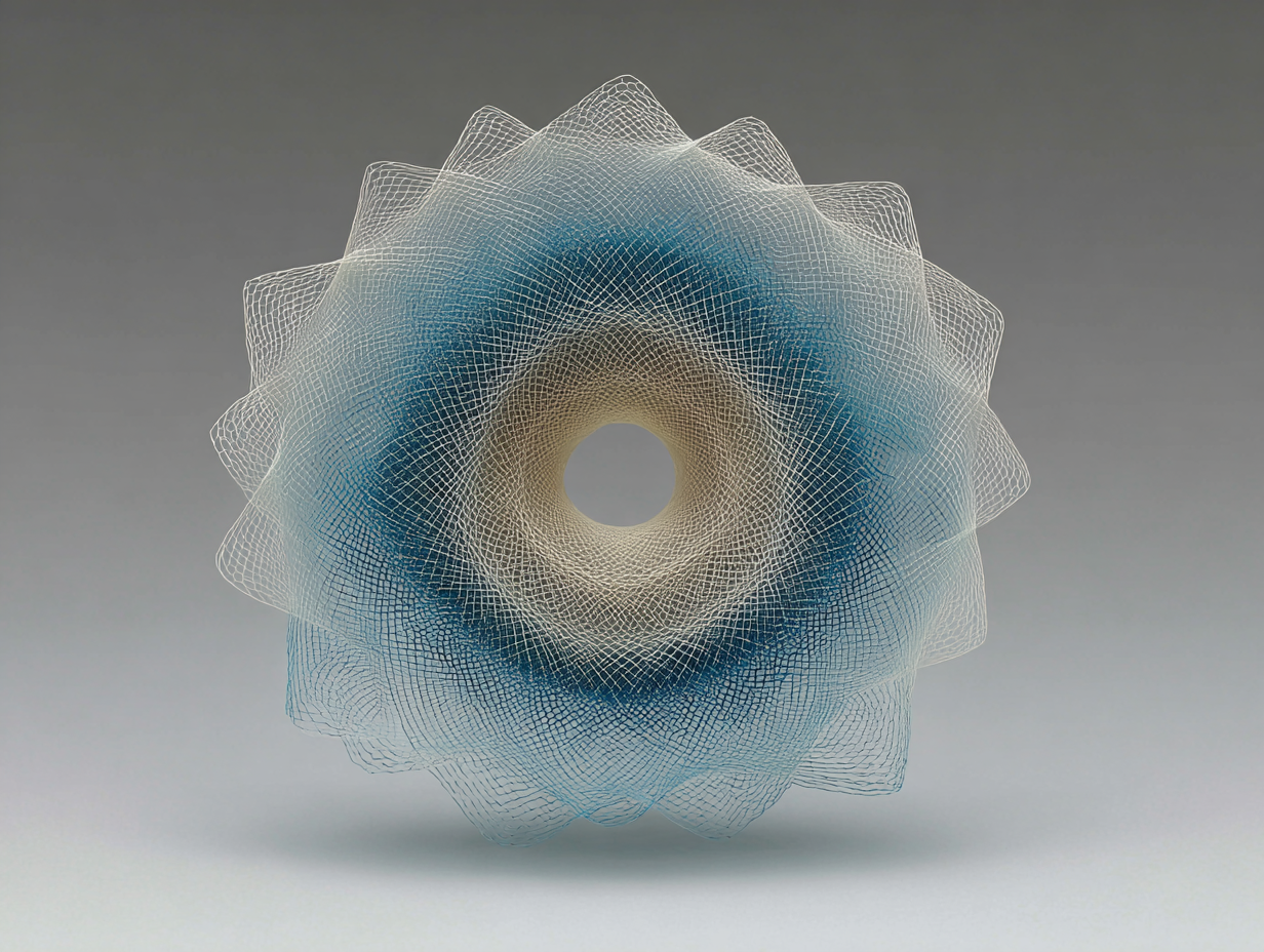 geometric abstraction, interlocking polygons forming a soft torus, thin fracture lines at the edges, expanding lattice bloom, minimal gallery void, fogged air, volumetric light slice, top-down 35mm, precise symmetry, ample negative space, matte paper grain + brushed metal microtexture, cyan and ivory with graphite accents, soft specular highlights, drifting dust motes, gentle pulse motion cue, quiet atmospheric depth --ar 4:3 --raw