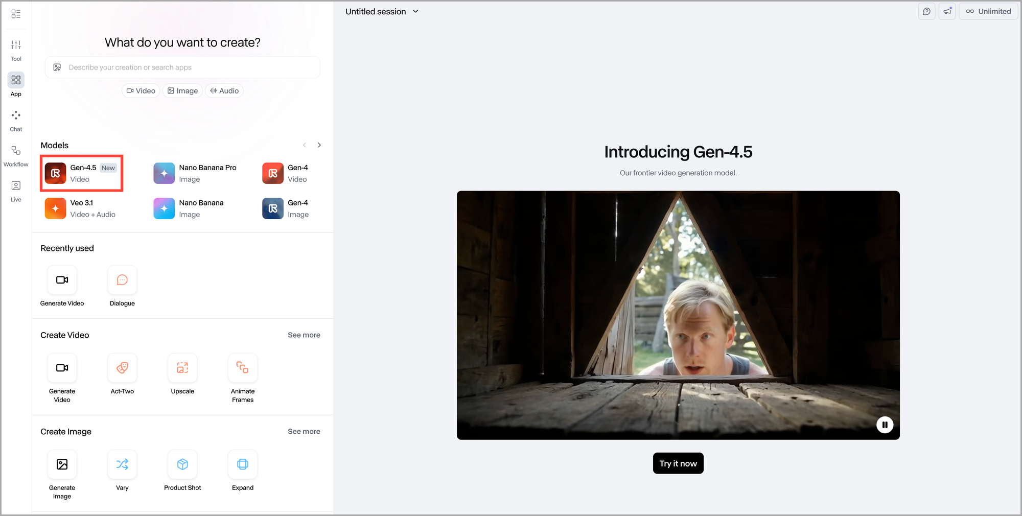 Runway λ‘κ·ΈμΈ ν, λ©μΈ νλ©΄μ Models μλ Gen-4.5λ₯Ό ν΄λ¦ν©λλ€.