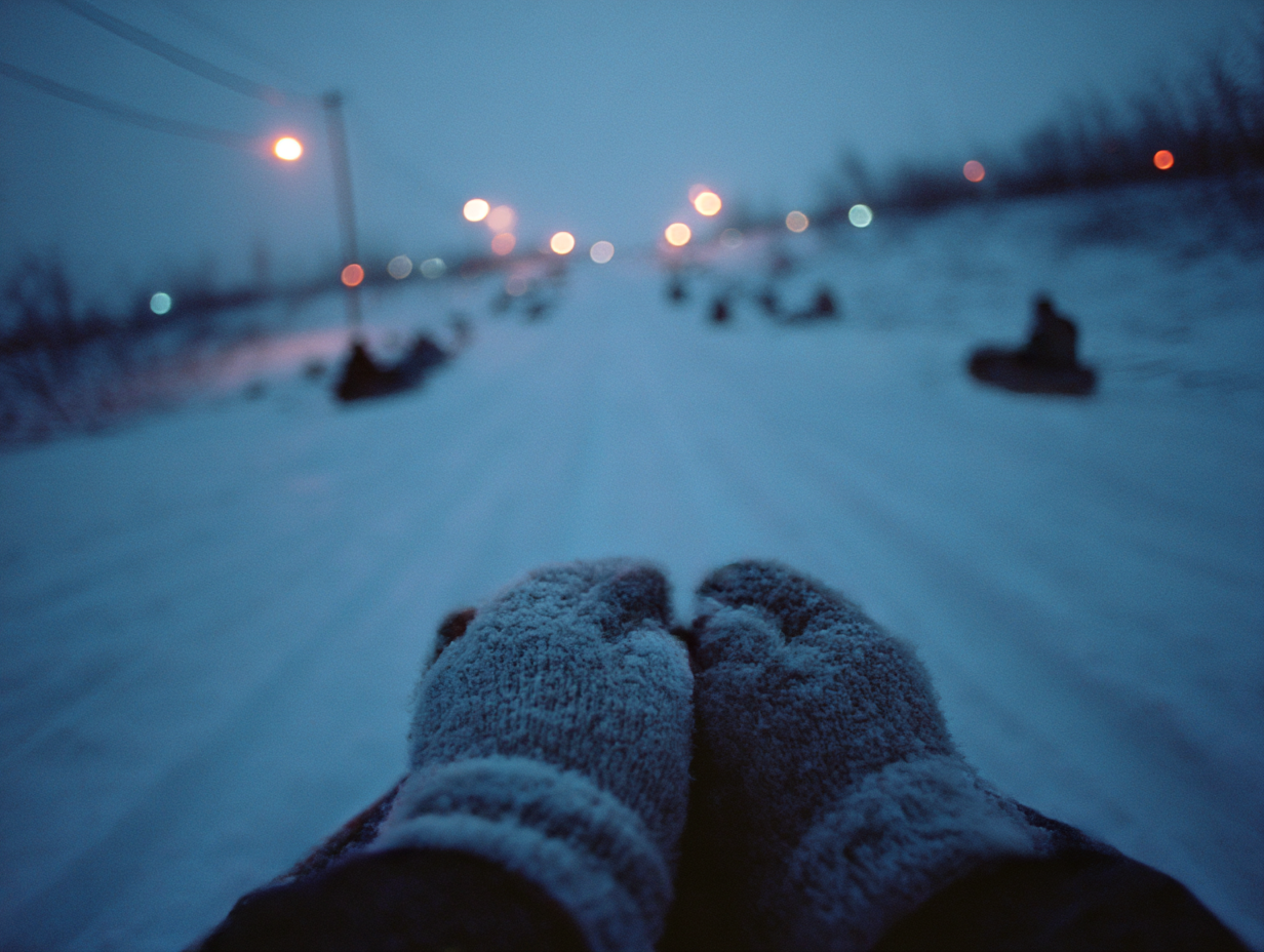 1st person view, wool gloves in a childβs hands, snowy sledding hill, dusk twilight, amber floodlights and icy blue shadows, breath mist in cold air, sled tracks leading lines, shallow depth of field, 35mm film feel, soft bokeh crowd, drifting snow dust, wool fiber texture, cinematic framing, gentle stillness --ar 4:3 --raw