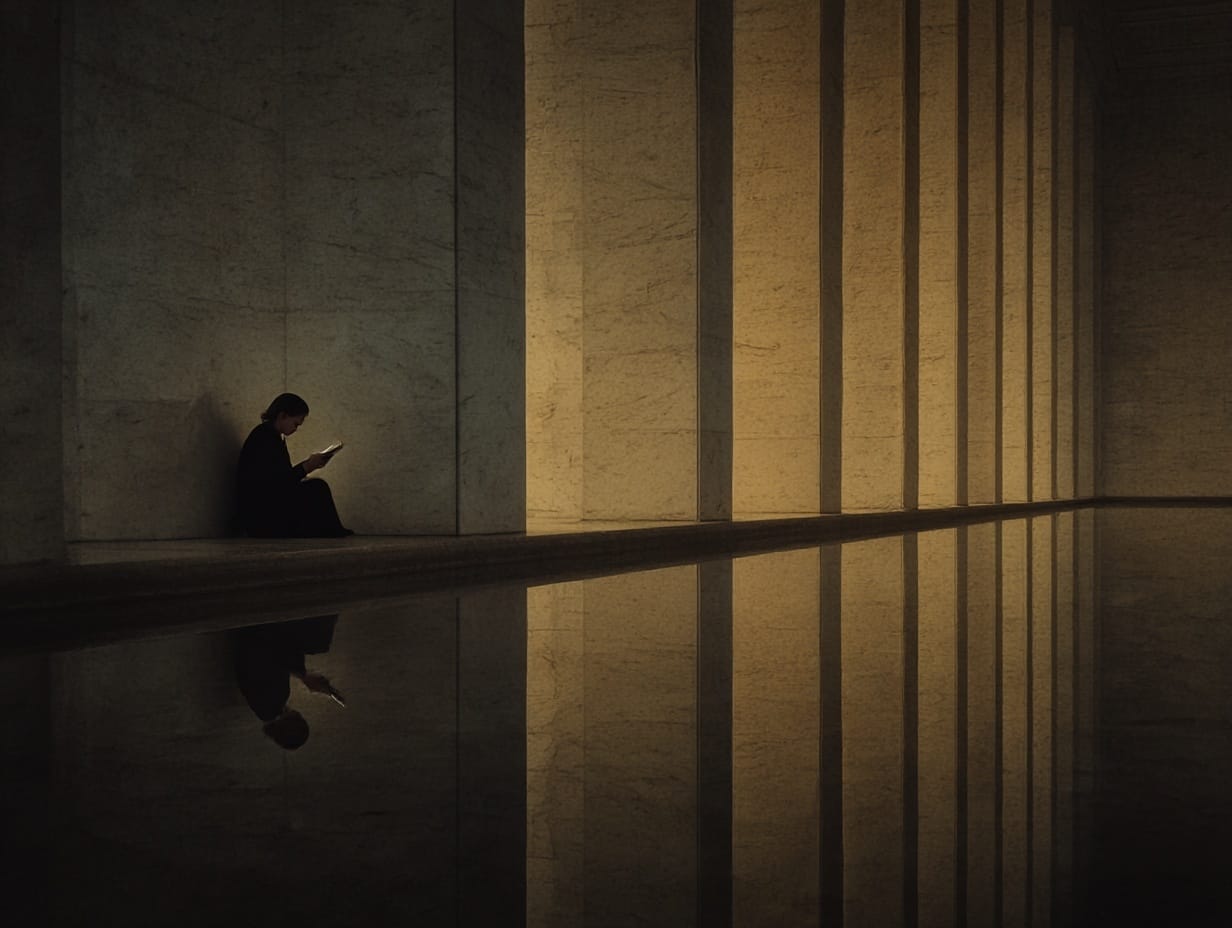 solitary leader reading a redacted dossier, vast marble corridor, midnight stillness, candlelit chiaroscuro, slow hush of fluorescent spill, 50mm lens, centered composition, layered reflections in a cracked mirror, paper grain texture, ink-stained fingertips, drifting dust motes, muted black and warm gold palette, quiet gravity, subtle air movement --chaos 10 --ar 4:3 --raw