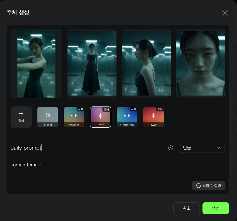 μ΄λ€ μ₯λ©΄μ΄ μμ±λκΈΈ μνλμ§ ν μ€νΈ ν둬ννΈλ₯Ό ν¨κ» μ λ ₯νκ³ , μ·μ μ’ λ₯μ λν΄ μ΅μνμ§ μμ λΆλ€μ 'μ€λ§νΈ λ©ν° μ·'μ μΌλ©΄ μμμ μ΄μΈλ¦¬λ ꡬμ±μΌλ‘ μμ±ν΄μ€λλ€.