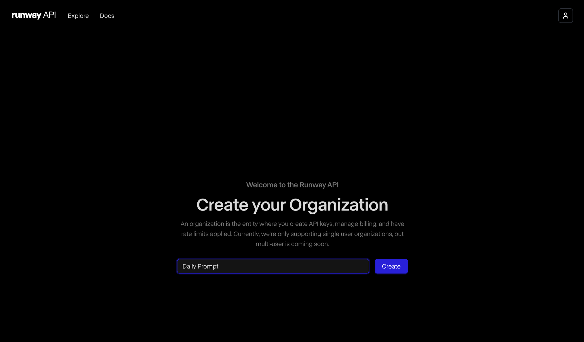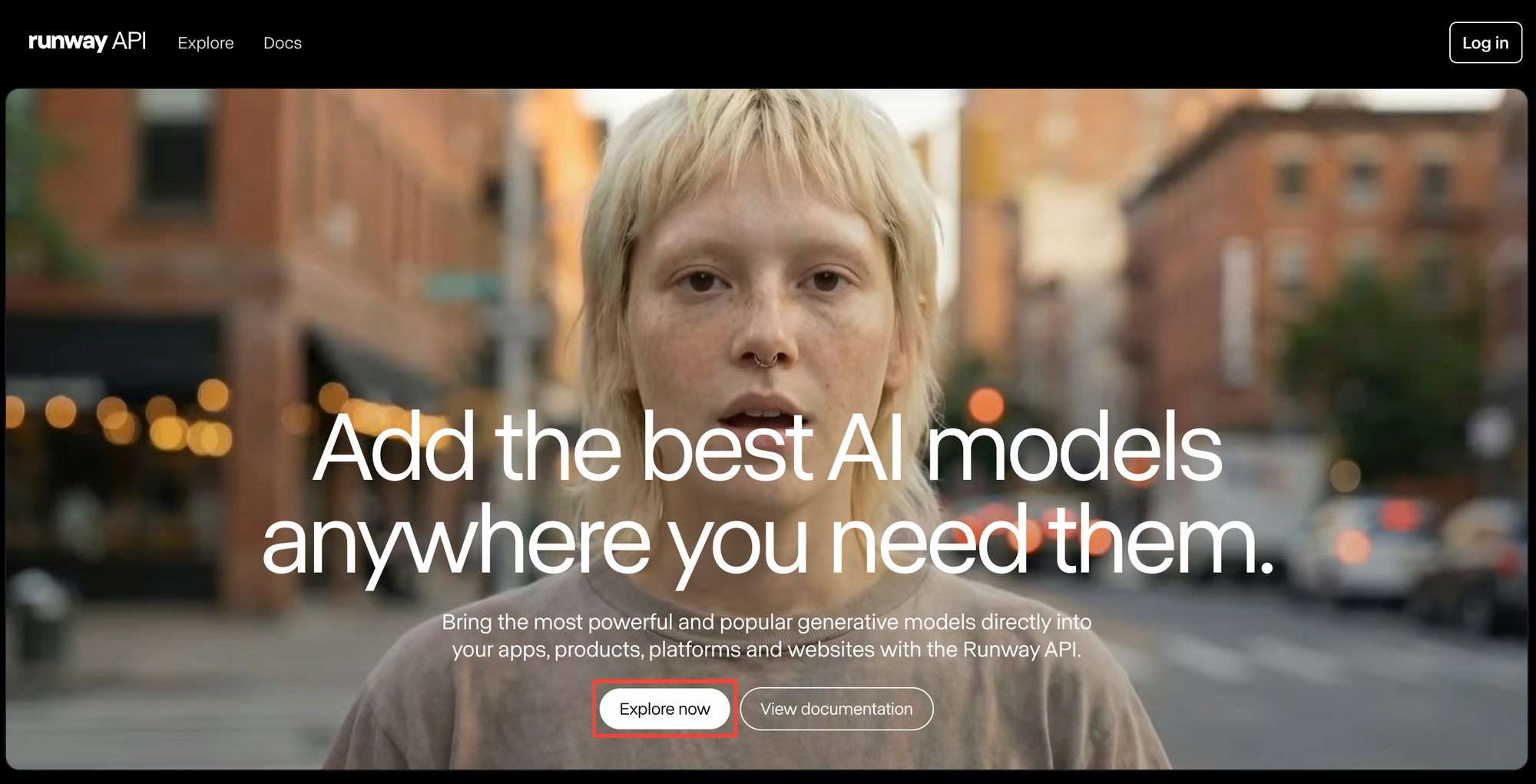 μ€λλΆν° 무λ£λ‘ 30λΆ λνλ₯Ό ν΄λ³Ό μ μλ€κ³ ν΄μ, Runway κ°μ΄λμ λ°λΌ μνμΌμ μ¬μ©ν΄λ³΄μμ΅λλ€. λ¨Όμ Runway API νμ΄μ§μμ μλμ κ°μ΄ 'Explore now'λ₯Ό ν΄λ¦ν©λλ€.