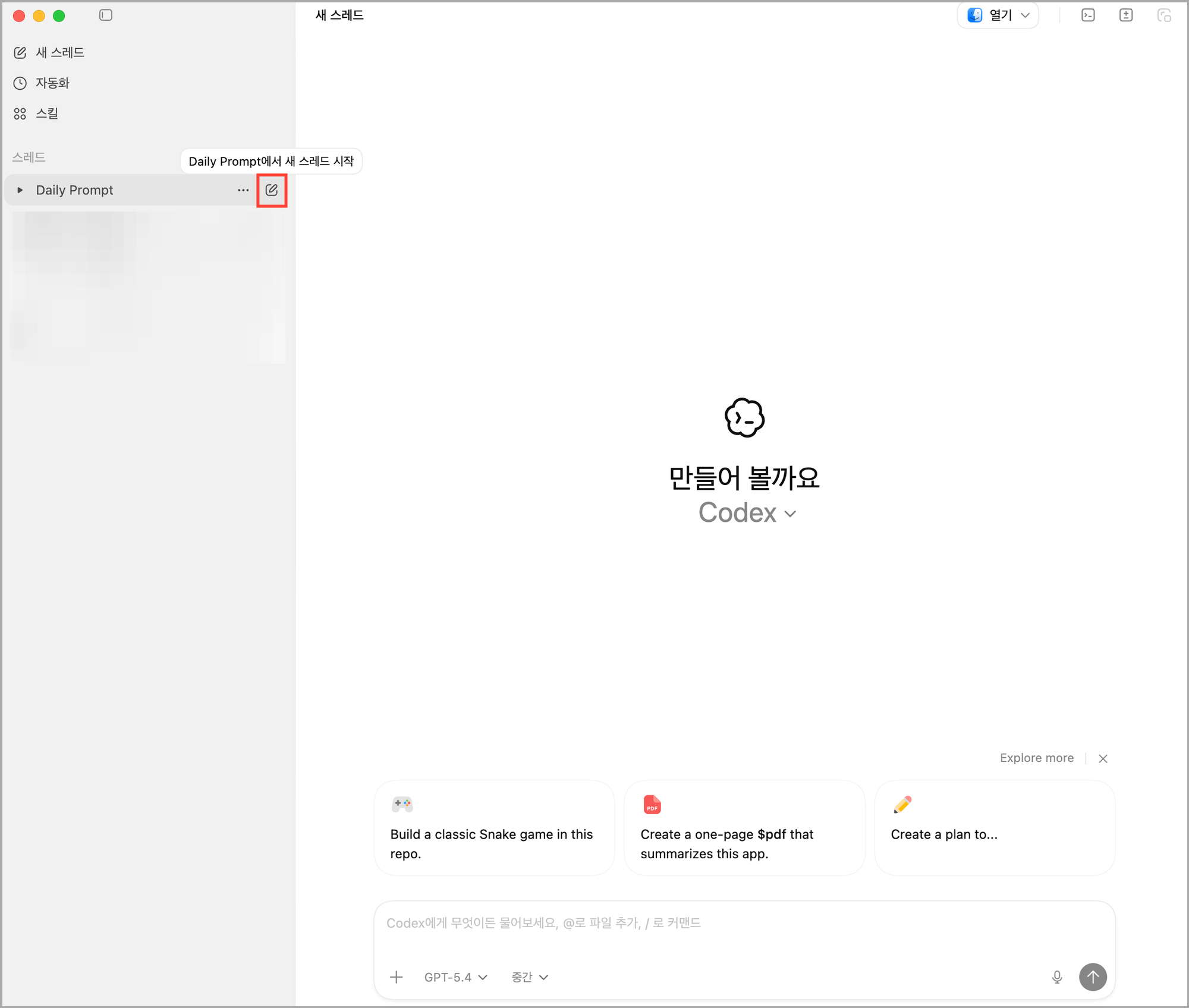 Codexμμ ν΄λκ° μλ€λ©΄ ν΄λλ₯Ό νλ λ§λ λ€, ν΄λλͺ μ 'μ μ€λ λ μμ λ²νΌ'μ ν΄λ¦ν©λλ€.