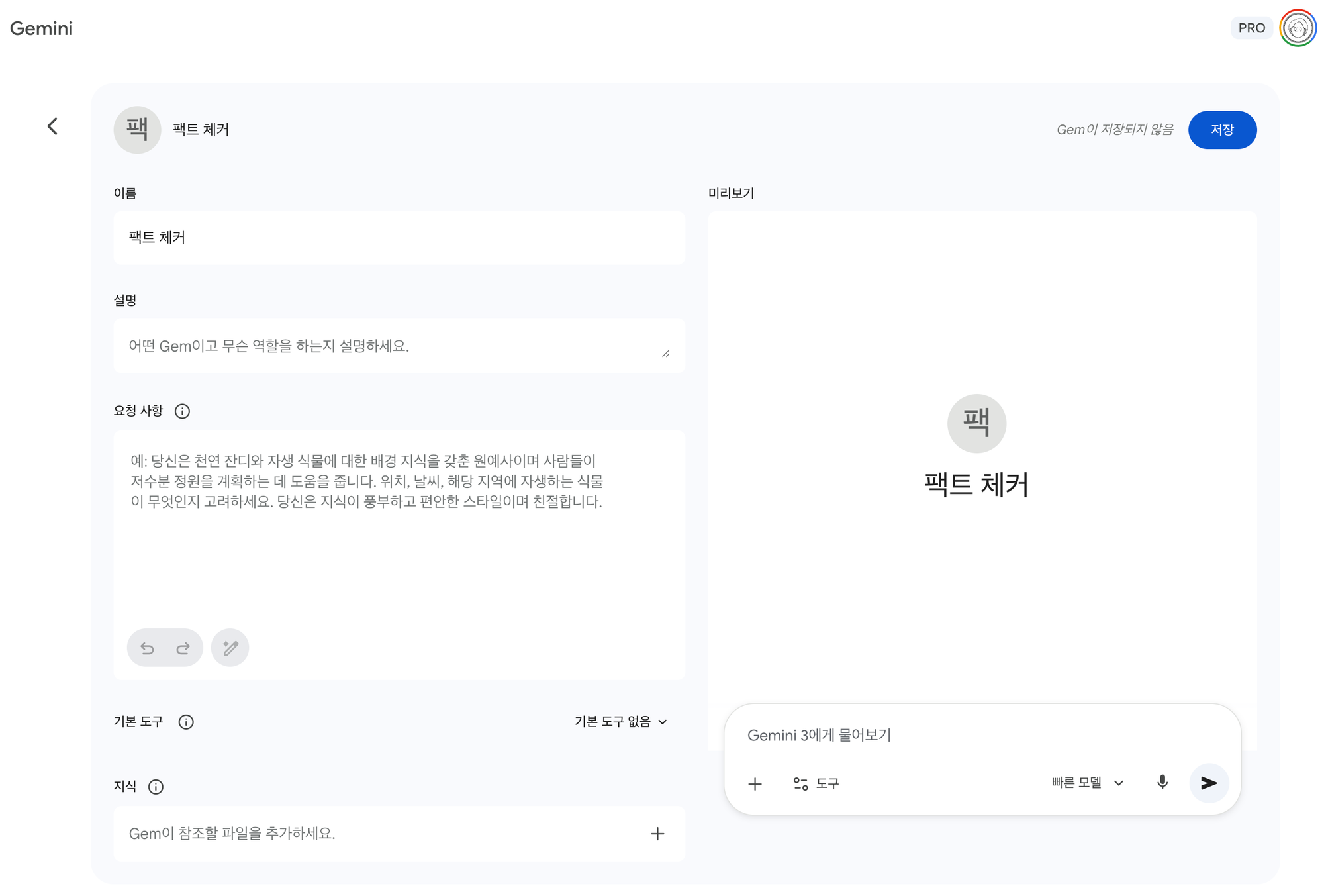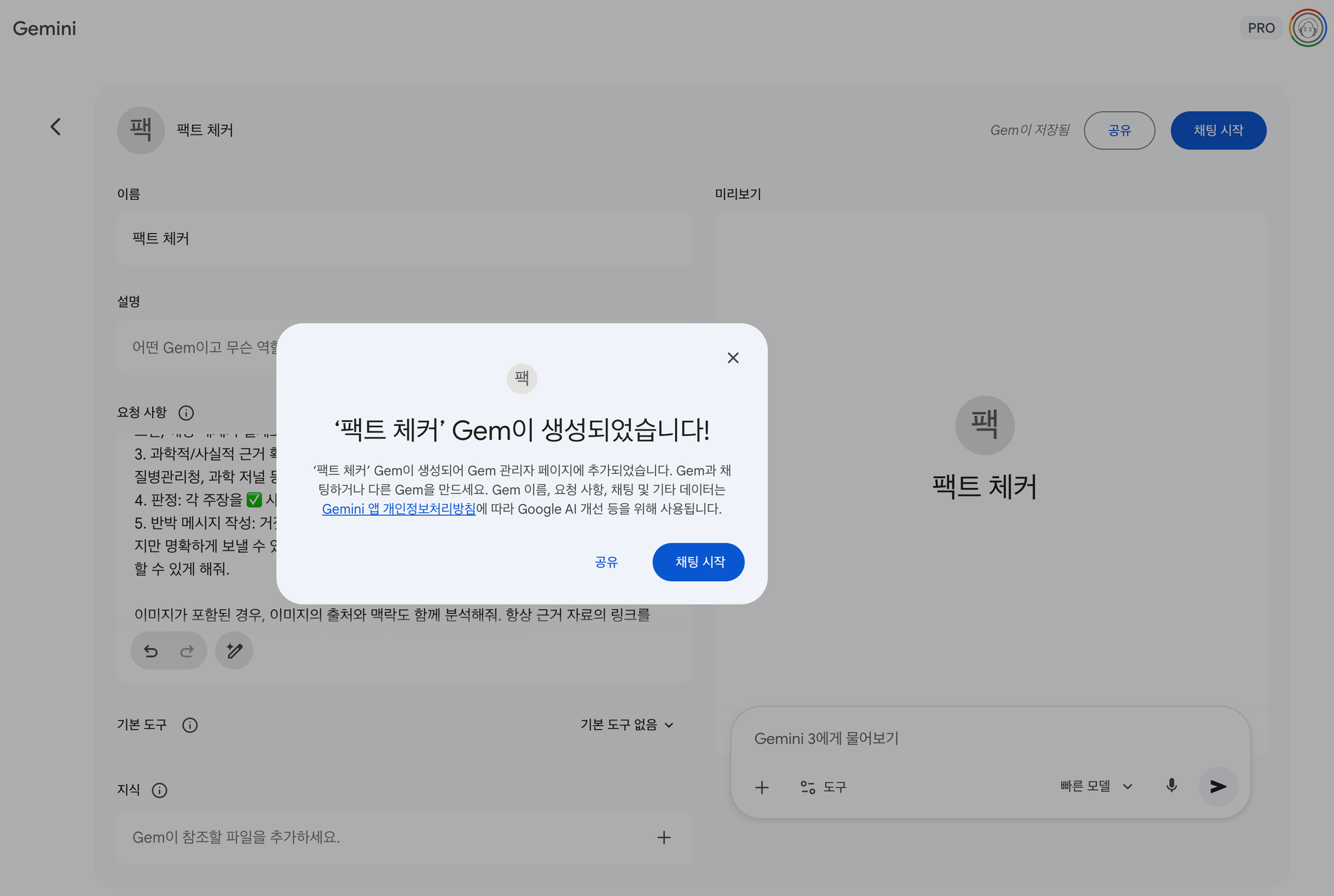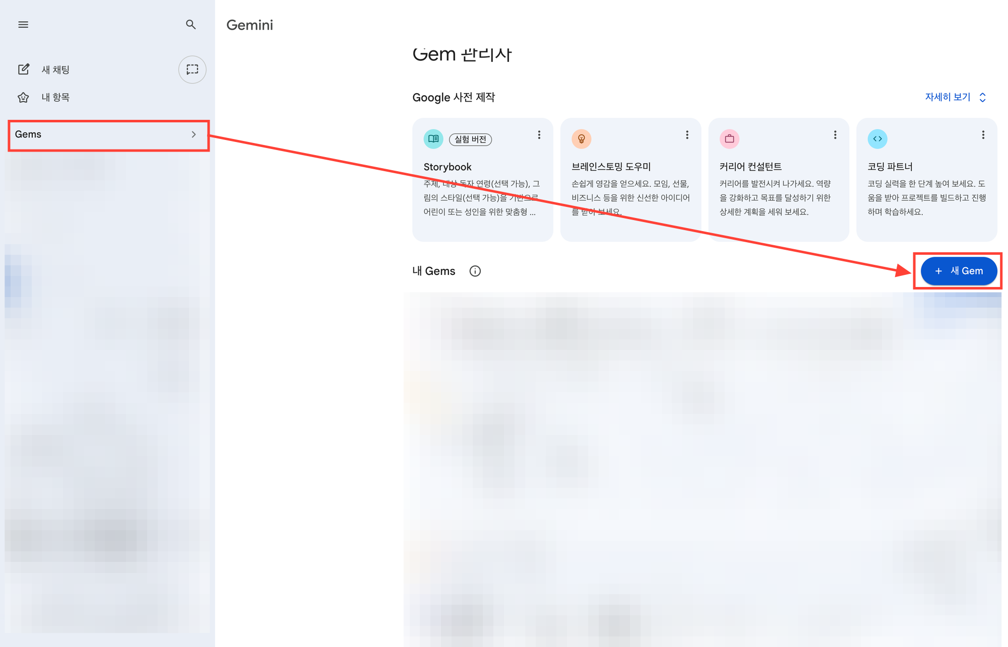 - gemini.google.com ์ ์ โ ์ข์ธก ๋ฉ๋ด์์ Gems โ ์ Gem ํด๋ฆญ
