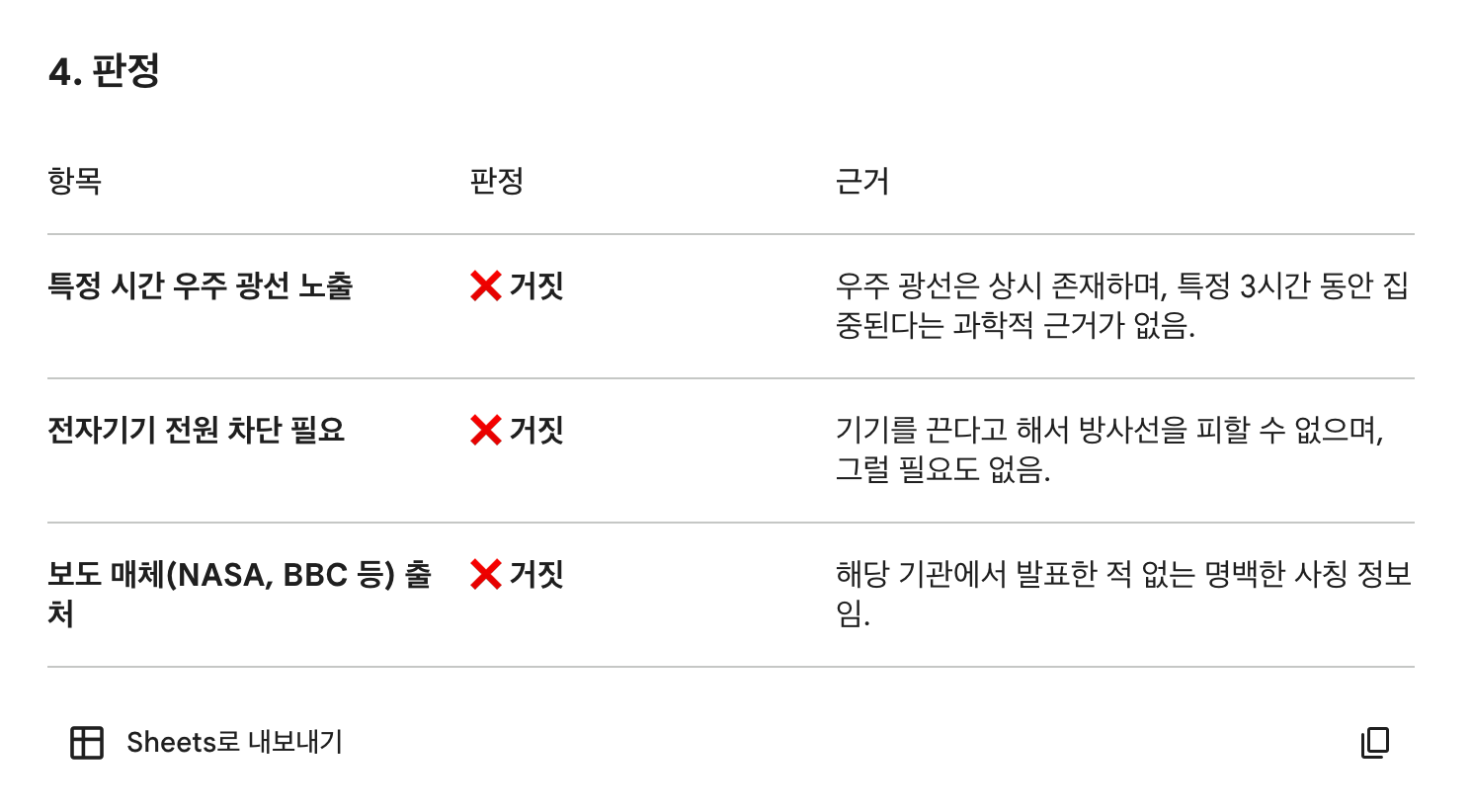 3. ๊ณผํ์ /์ฌ์ค์ ๊ทผ๊ฑฐ ํ์ธ: ๊ฐ ์ฃผ์ฅ์ด ๊ณผํ์ ๊ทผ๊ฑฐ๊ฐ ์๋์ง, ๊ณต์ ๋ ฅ ์๋ ๊ธฐ๊ด(WHO, ์ง๋ณ๊ด๋ฆฌ์ฒญ, ๊ณผํ ์ ๋ ๋ฑ)์ ๋ฐํ์ ์ผ์นํ๋์ง ๊ฒ์ฆํด์ค.