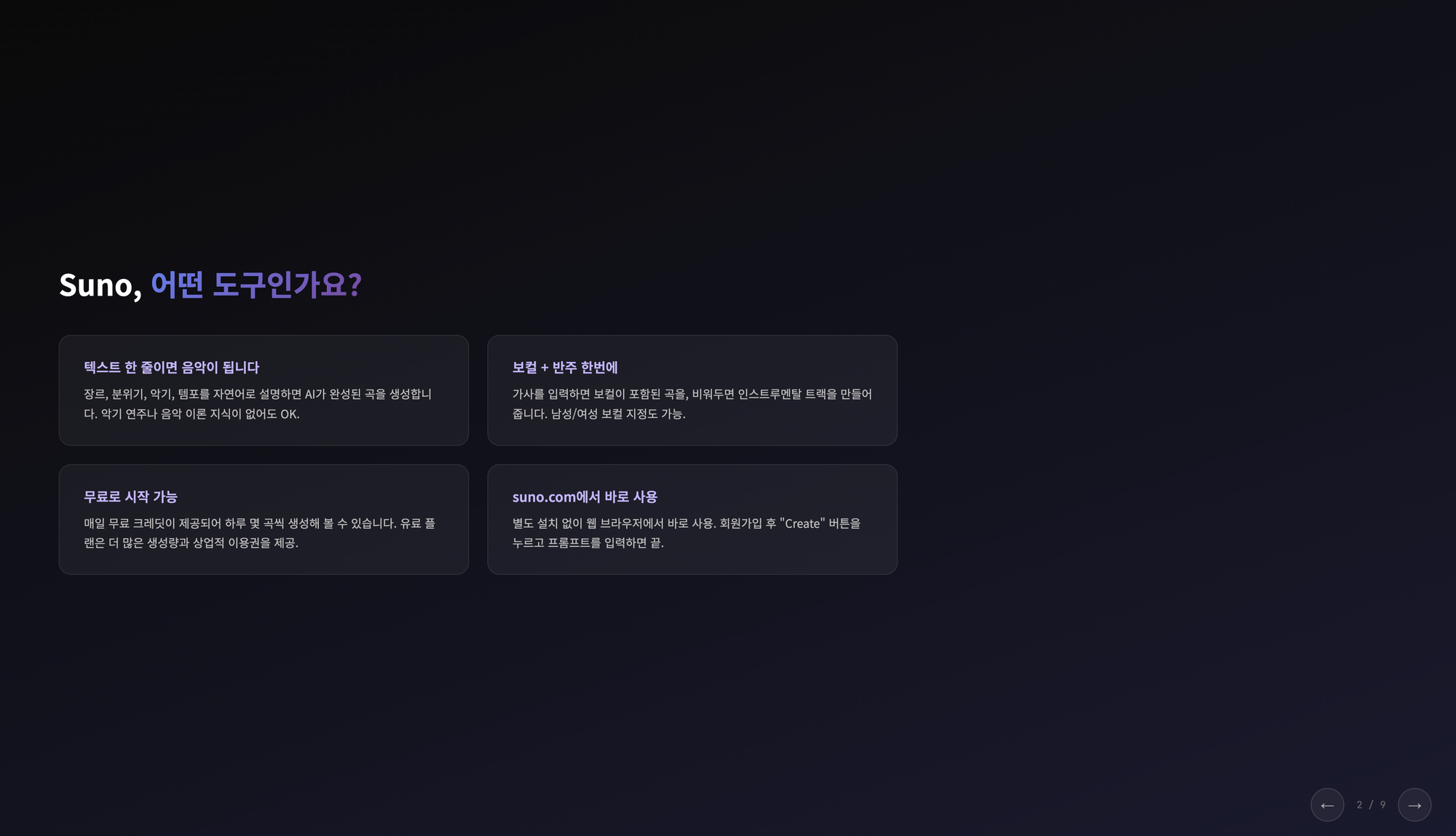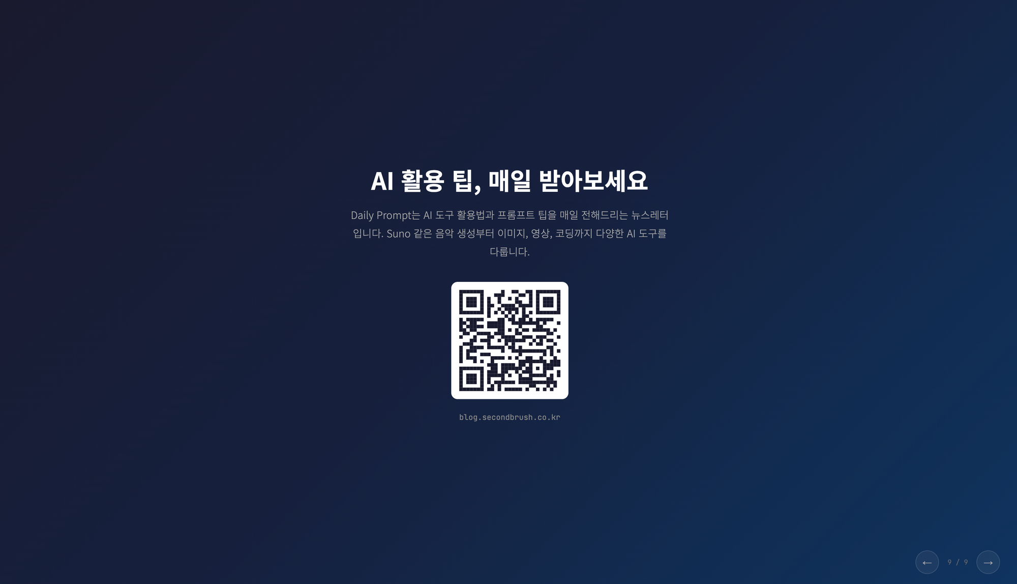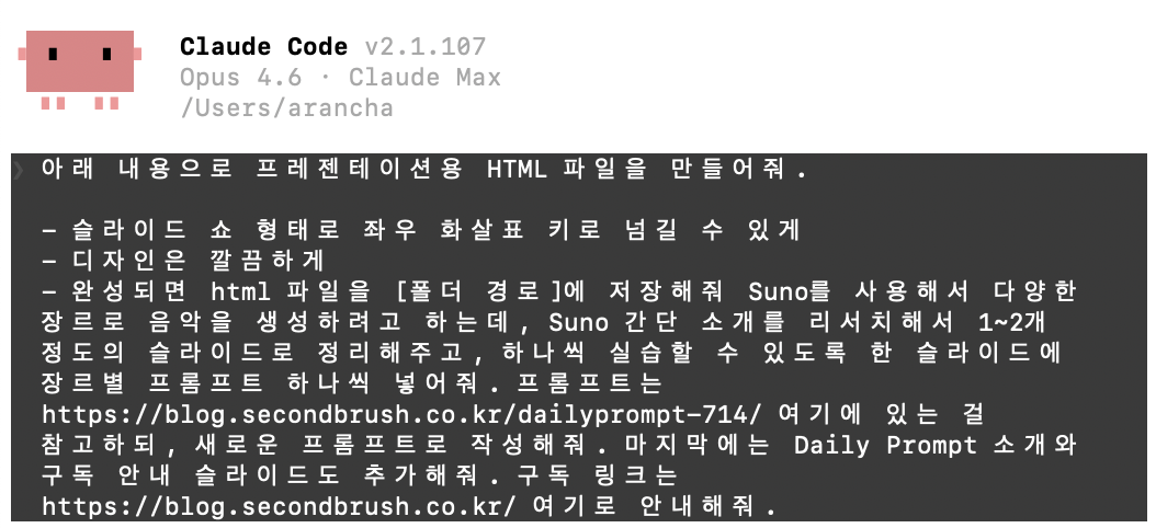 Sunoλ₯Ό μ¬μ©ν΄μ λ€μν μ₯λ₯΄λ‘ μμ μ μμ±νλ €κ³ νλλ°, Suno κ°λ¨ μκ°λ₯Ό 리μμΉν΄μ 1~2κ° μ λμ μ¬λΌμ΄λλ‘ μ 리ν΄μ£Όκ³ , νλμ© μ€μ΅ν μ μλλ‘ ν μ¬λΌμ΄λμ μ₯λ₯΄λ³ ν둬ννΈ νλμ© λ£μ΄μ€. ν둬ννΈλ https://blog.secondbrush.co.kr/dailyprompt-714/ μ¬κΈ°μ μλ κ±Έ μ°Έκ³ νλ, μλ‘μ΄ ν둬ννΈλ‘ μμ±ν΄μ€. λ§μ§λ§μλ Daily Prompt μκ°μ ꡬλ μλ΄ μ¬λΌμ΄λλ μΆκ°ν΄μ€. ꡬλ λ§ν¬λ https://blog.secondbrush.co.kr/ μ¬κΈ°λ‘ μλ΄ν΄μ€.