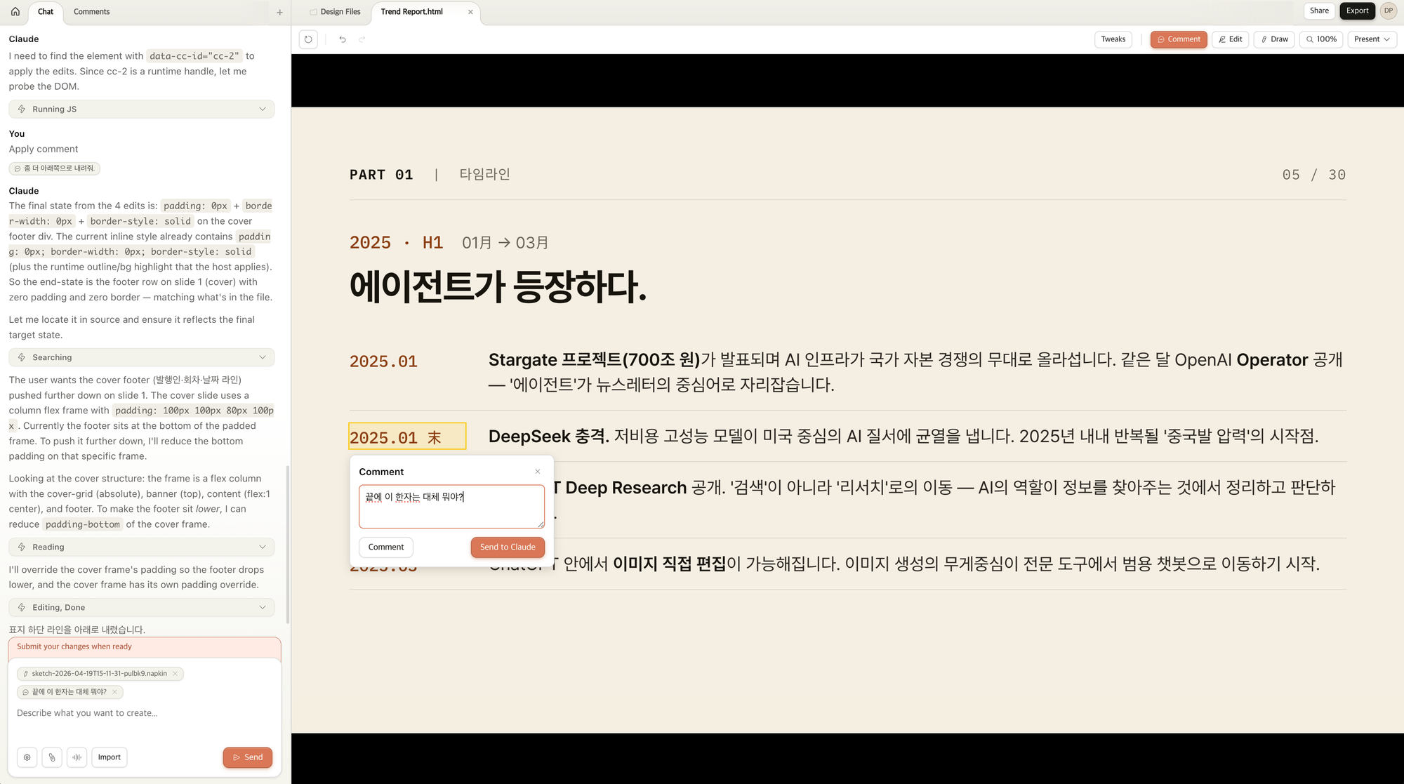 ์ ๋ Codex์์ ๋ง๋ ๋์์ธ ์์คํ ๋ฌธ์(๋งํฌ๋ค์ด ๋ฌธ์)๊ฐ ์์ด์ ์ด๋ฅผ ํ๋กฌํํธ ์ ๋ ฅํ ๋ ํจ๊ป ์ ๋ก๋ํ๊ณ , ๋ฌธ์๋ก ์์ฑ๋ Trend-report ํ์ผ๋ ํจ๊ป ์ ๋ก๋ํ ๋ค ์๋ ํ๋กฌํํธ๋ฅผ ์ ๋ ฅํ์์ต๋๋ค.
