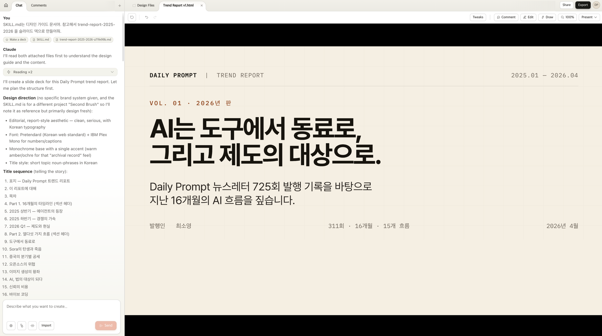 Claude Design์ claude.ai/design์์ ์ฌ์ฉํ์ค ์ ์๊ณ , ์ ๋ฃ ๊ตฌ๋ ์ ํด์ผ ํฉ๋๋ค. ์ ๋ ๋๋ง์นจ ๊ตฌ๋ ์ ๋ถ๋ค๊ป ๋ณด๋ด๋๋ฆด Trend Report ๋์์ธ ์์ ์ ํด์ผํด์, Claude Design์ ์ฌ์ฉํด๋ณด์์ต๋๋ค.