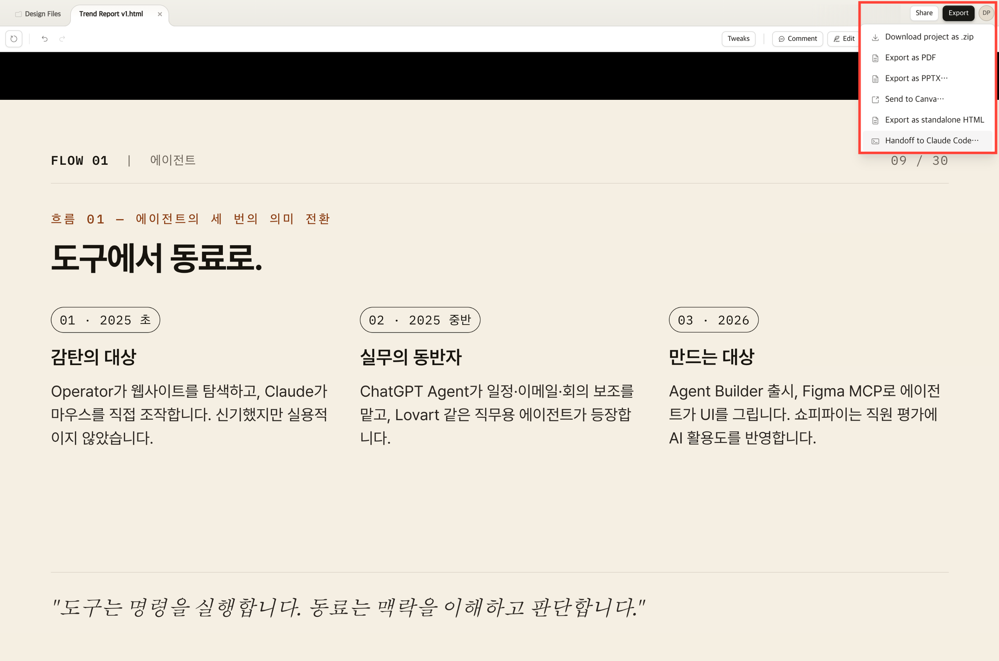 Export(๋ด๋ณด๋ด๊ธฐ) ๋ฒํผ์ ํด๋ฆญํ๋ฉด ์ฝ๋๊ฐ ๋ด๊ธด zip ํ์ผ์ด๋ PDF, PPTX, HTML๋ก ๋ด๋ณด๋ผ ์ ์์ต๋๋ค. Canva๋ก ๋ณด๋ด์ ์์ ์์ ์ ์งํํ ์๋ ์์ต๋๋ค.