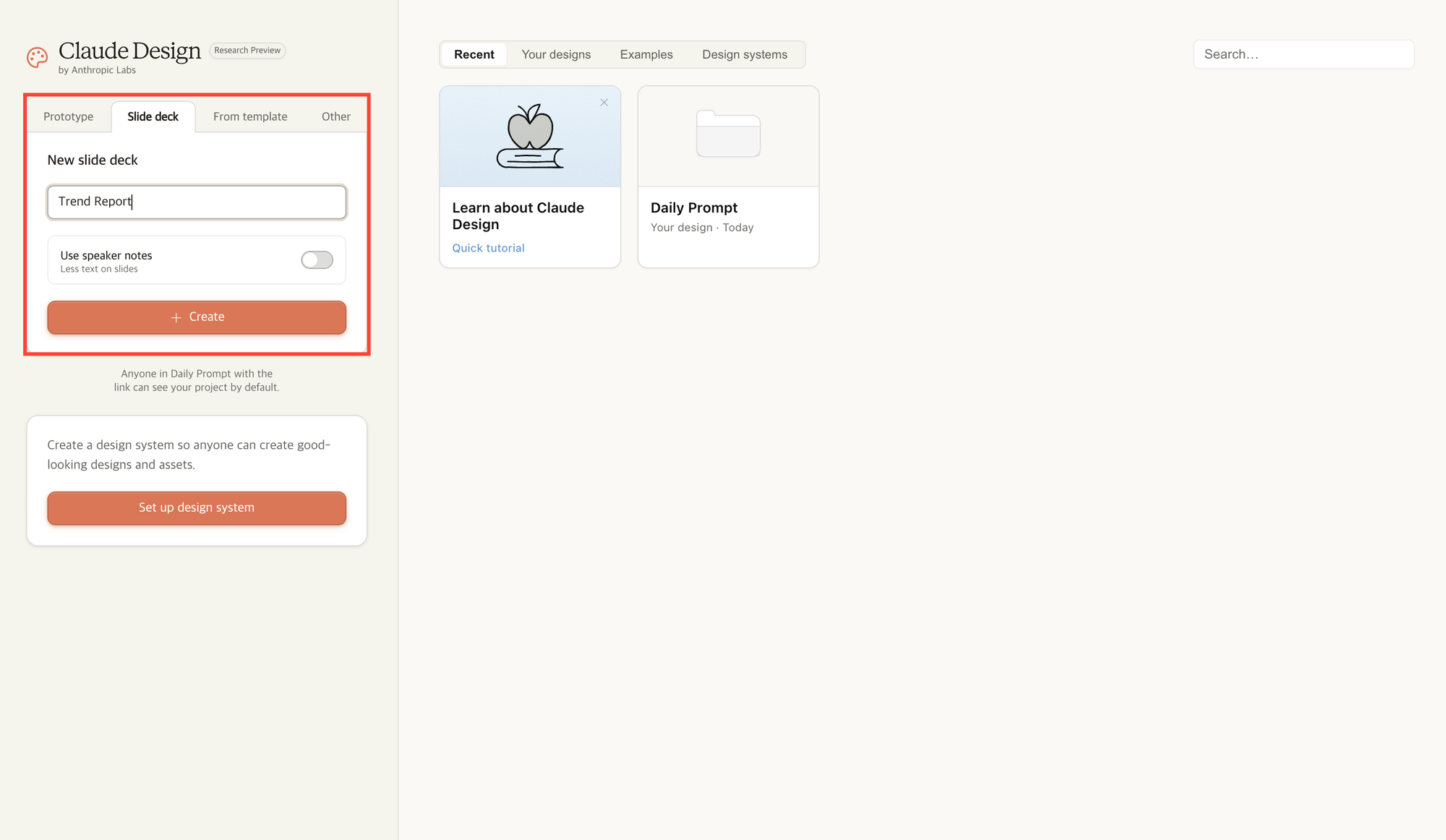 claude.ai/design์์ 'Slide deck'์ ์ ํํ๊ณ ์ ๋ชฉ์ ์ ๋ ฅํ ๋ค, 'Create' ๋ฒํผ์ ํด๋ฆญํฉ๋๋ค.