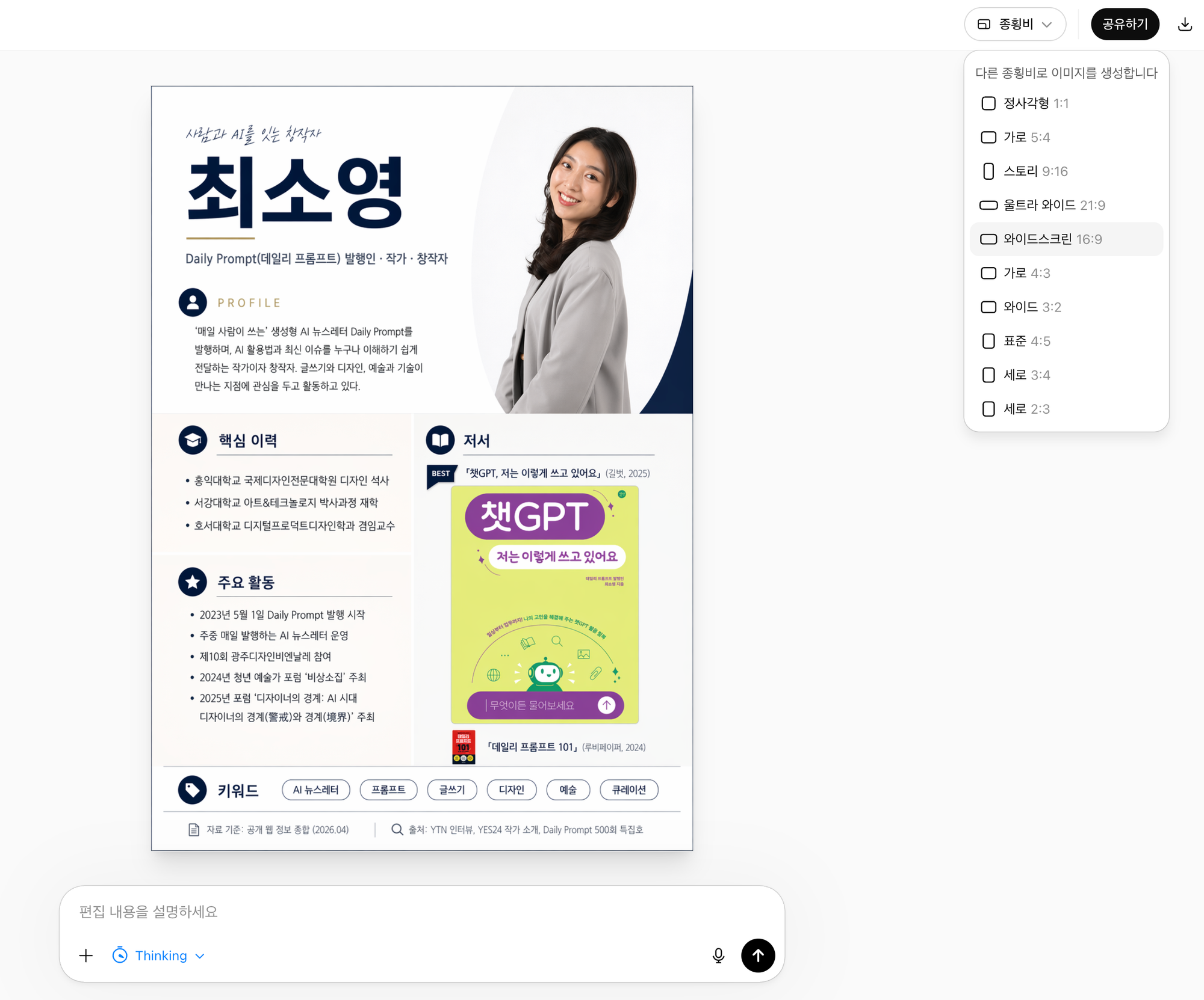 ์ด๋ฏธ์ง๋ฅผ ํ ๋ฒ ํด๋ฆญํ๋ฉด ์ค๋ฅธ์ชฝ ์๋จ '์ข ํก๋น' ๋ฒํผ์ ํด๋ฆญํด ๋ค๋ฅธ ์ข ํก๋น๋ก ์ด๋ฏธ์ง๋ฅผ ์์ฑํ ์ ์์ต๋๋ค.