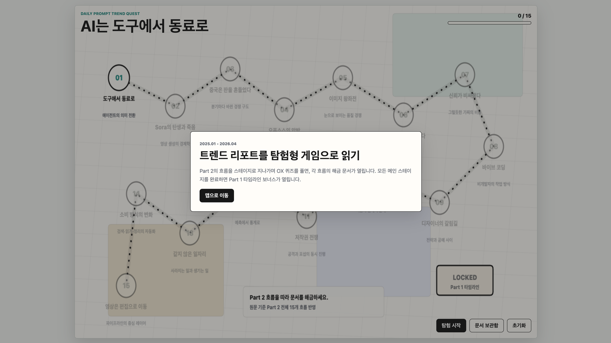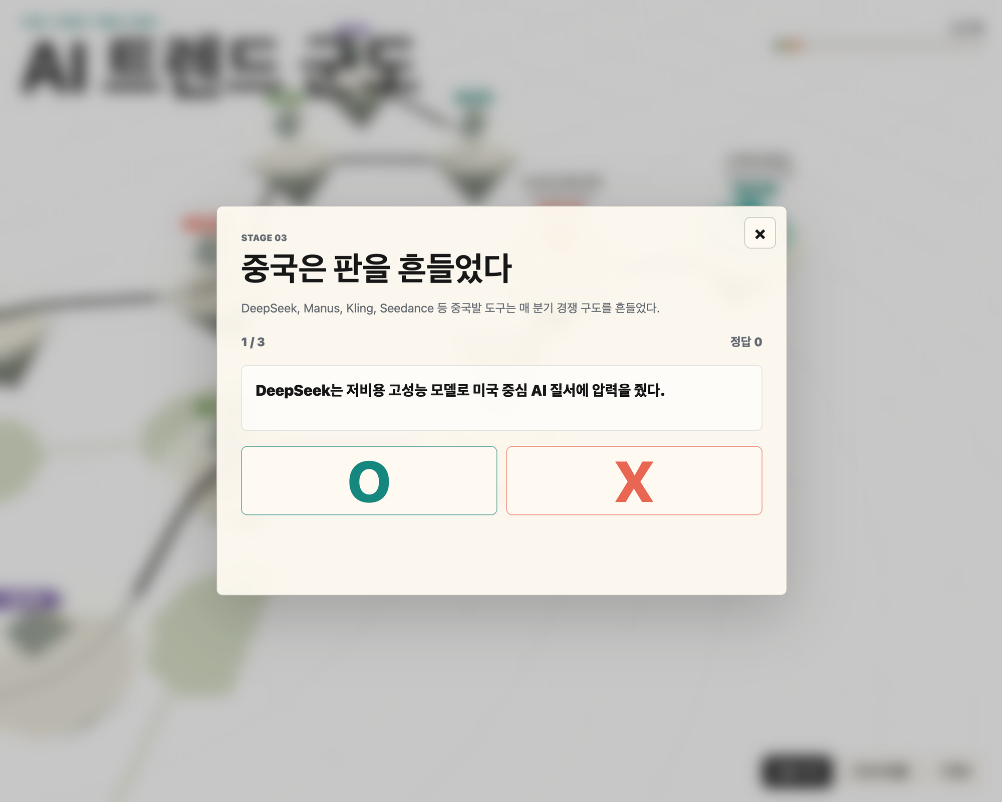 μ€ν μ΄μ§(=νΈλ λ ν νλ¦) λ³λ‘ OX ν΄μ¦λ₯Ό ν μ μκ³ , μ μ€ν μ΄μ§λ₯Ό ν΄λ¦¬μ΄ν΄μΌ λ€μ μ€ν μ΄μ§κ° μ€νλ©λλ€.