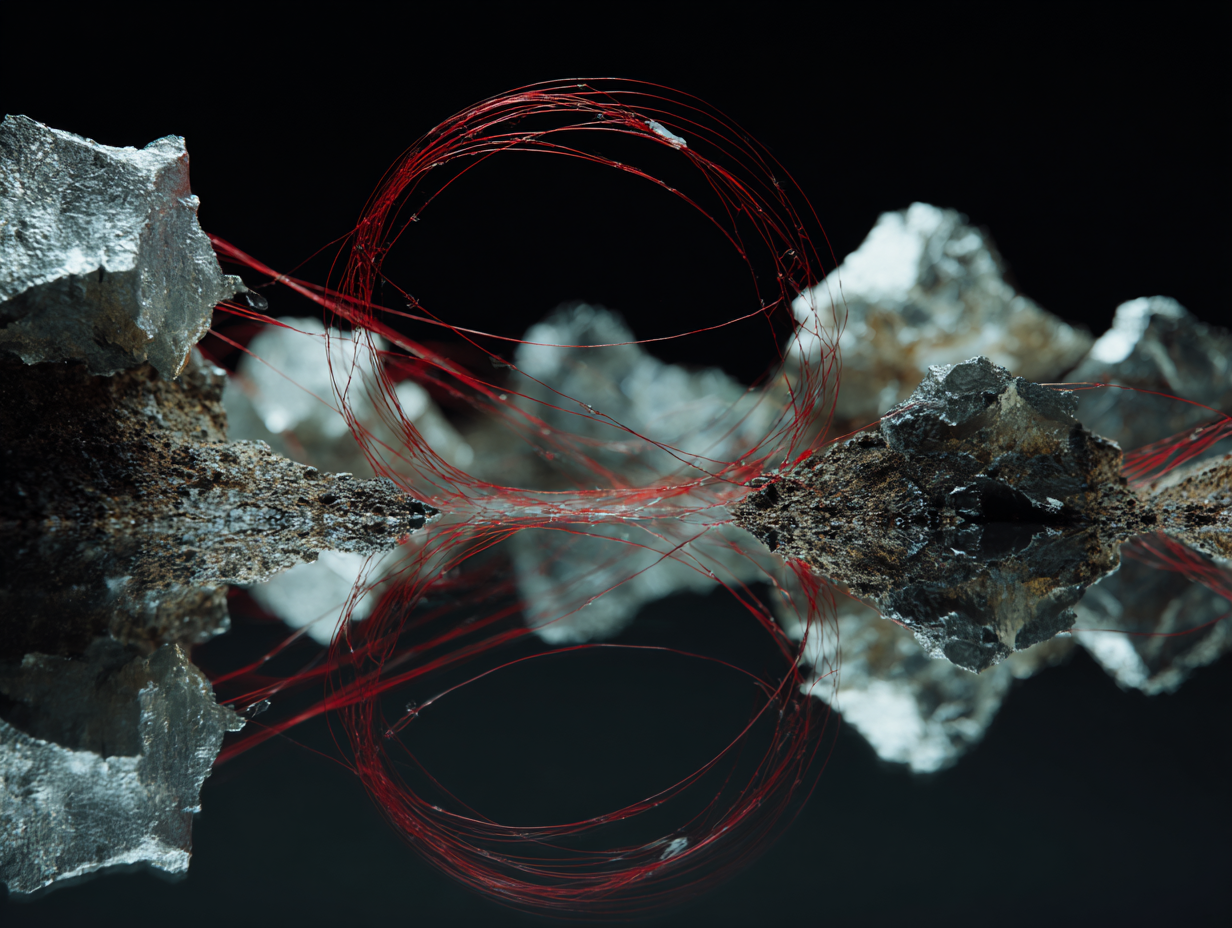 postmodern conceptual sculpture, severed red thread tensioned across floating mirror shards, resin skin, brushed stainless fragments, visceral minimalism, isolated artwork, matte black seamless backdrop, dramatic rim light, shallow depth of field, ultra-detailed texture --chaos 5 --ar 4:3