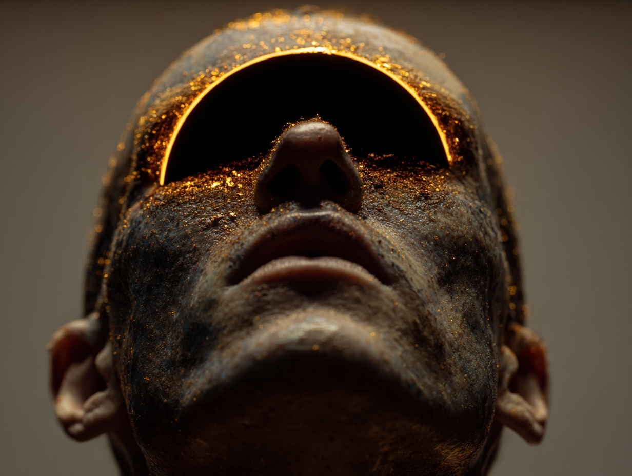 Surreal portrait, eyelids as an eclipse motif over a blazing sun, eyebrows straining upward, breath rendered as sound-waves and amber particles, minimal studio space, glossy skin texture, high contrast rim light, symmetrical composition, micro-details --chaos 5 --ar 4:3